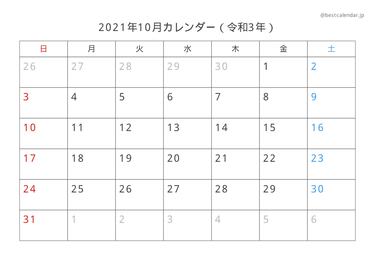 2021年10月のカレンダー(A4縦向き)です。記入重視のレイアウトで設計されています。