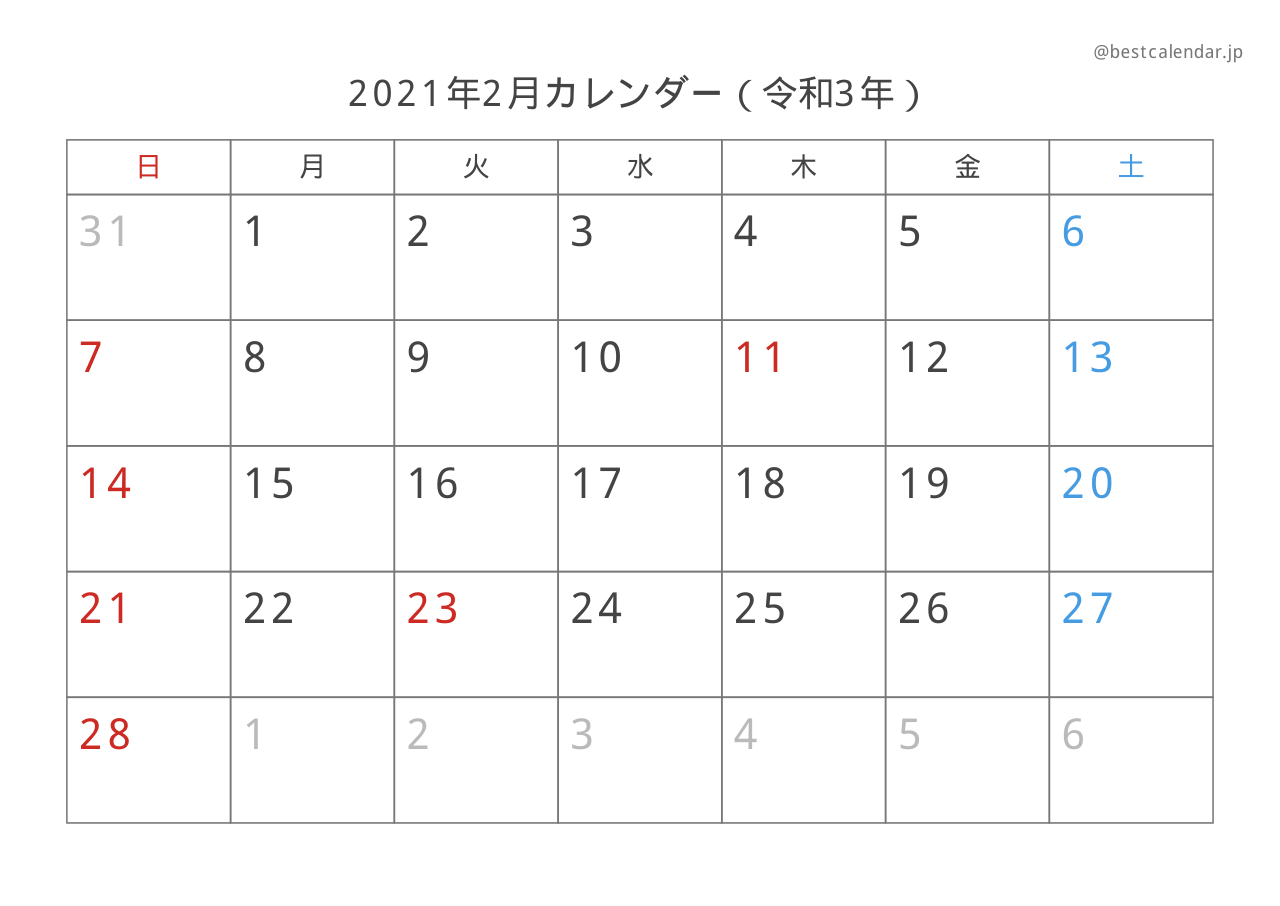 2021年2月のカレンダーです。A4サイズ横向きで印刷に最適化されています。