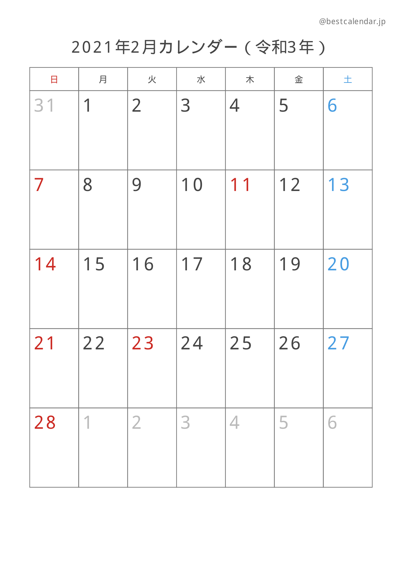 2021年2月のカレンダー(A4縦向き)です。記入重視のレイアウトで設計されています。
