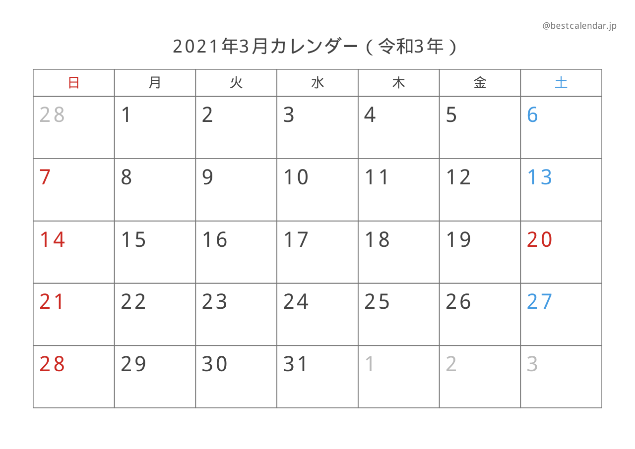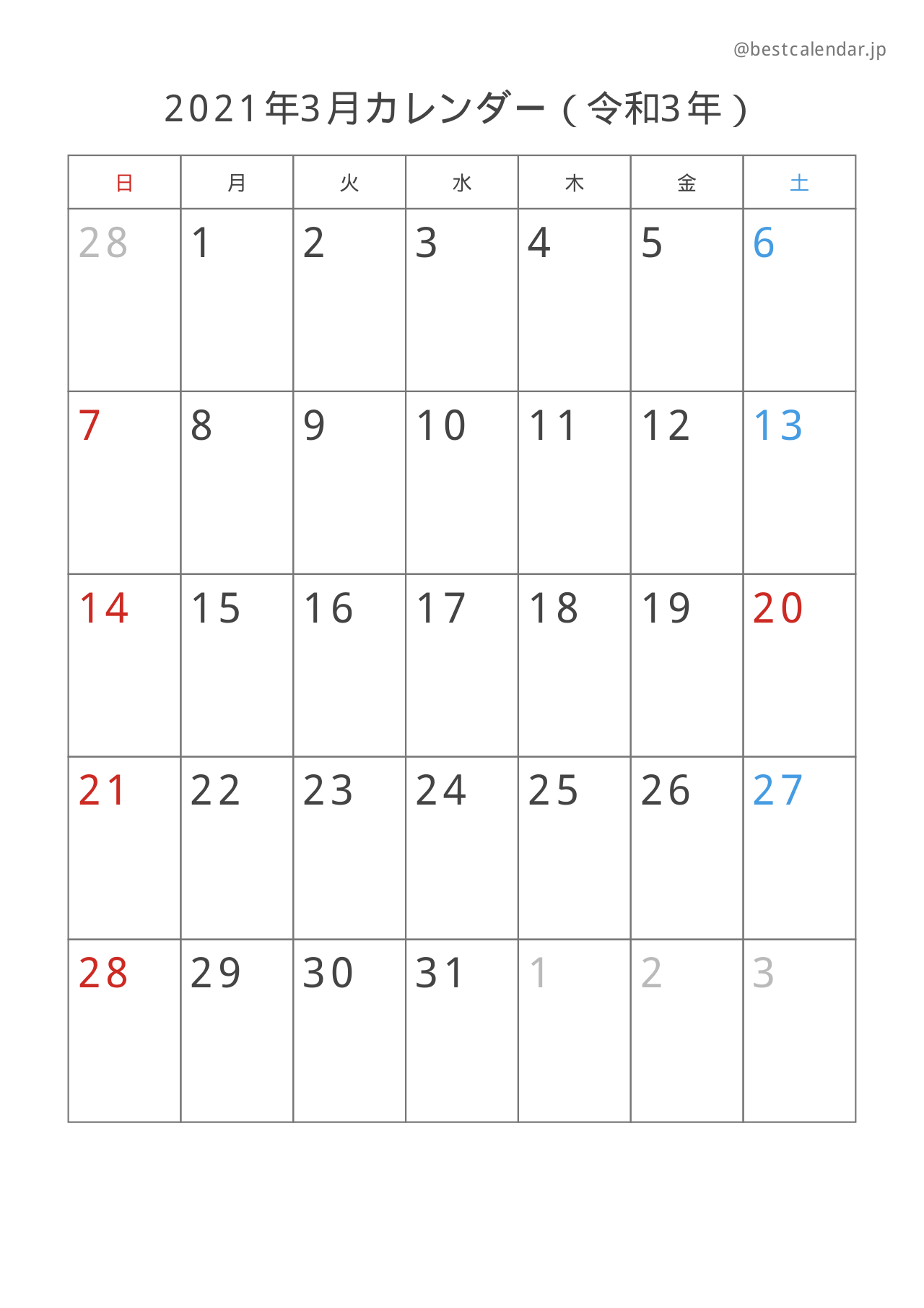 2021年3月のカレンダー(A4縦向き)です。記入重視のレイアウトで設計されています。