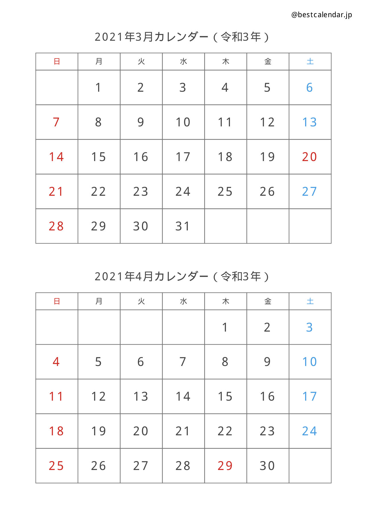 2021年3-4月の2ヶ月分を1枚にまとめたA4縦向きカレンダーです。