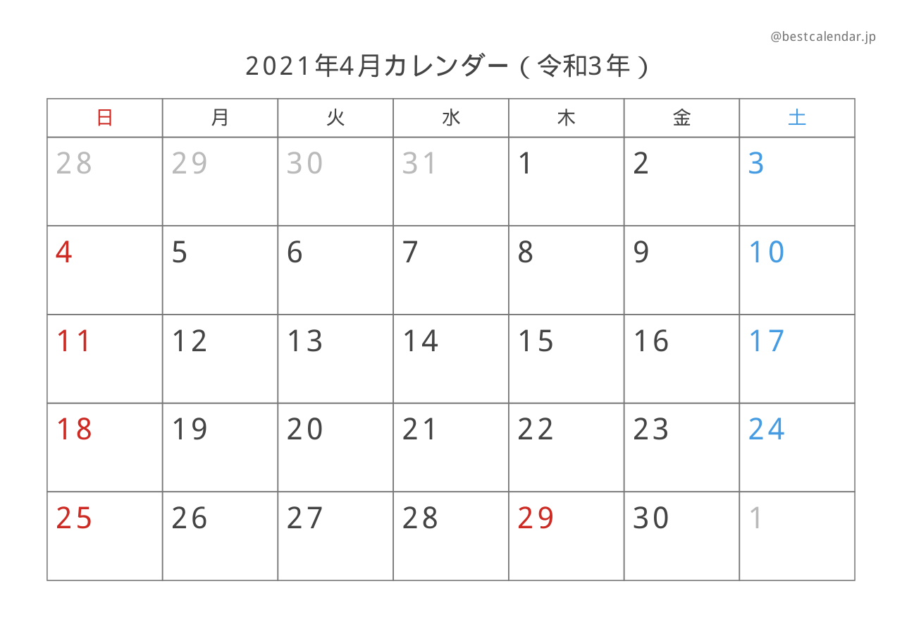 2021年4月のカレンダー(A4縦向き)です。記入重視のレイアウトで設計されています。