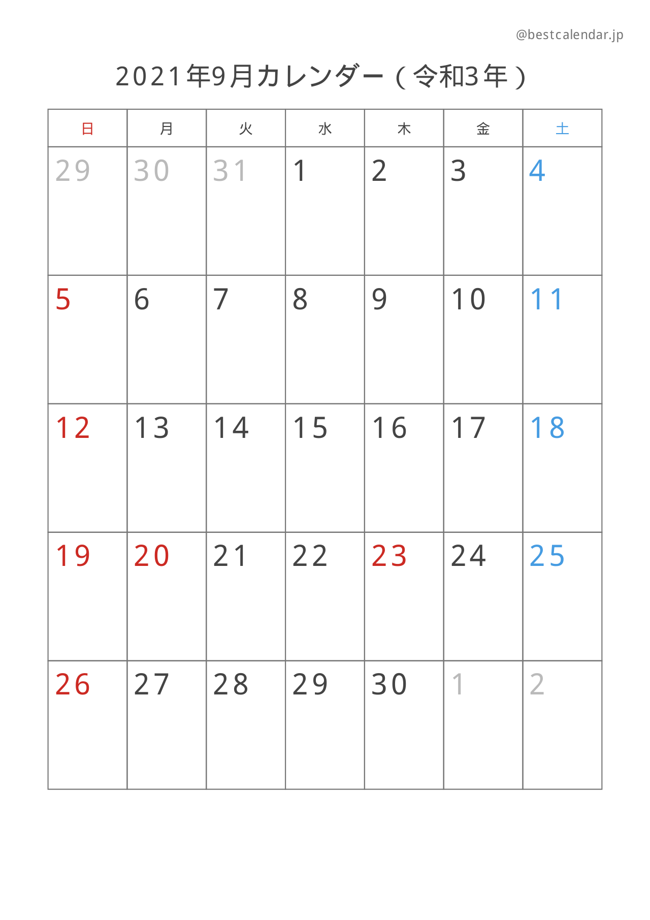 2021年9月のカレンダー(A4縦向き)です。記入重視のレイアウトで設計されています。