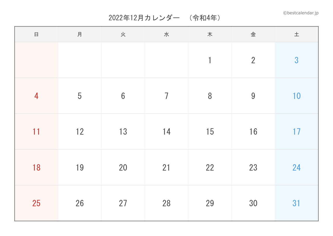 2022年12月のカレンダーです。A4サイズ横向きで印刷に最適化されています。