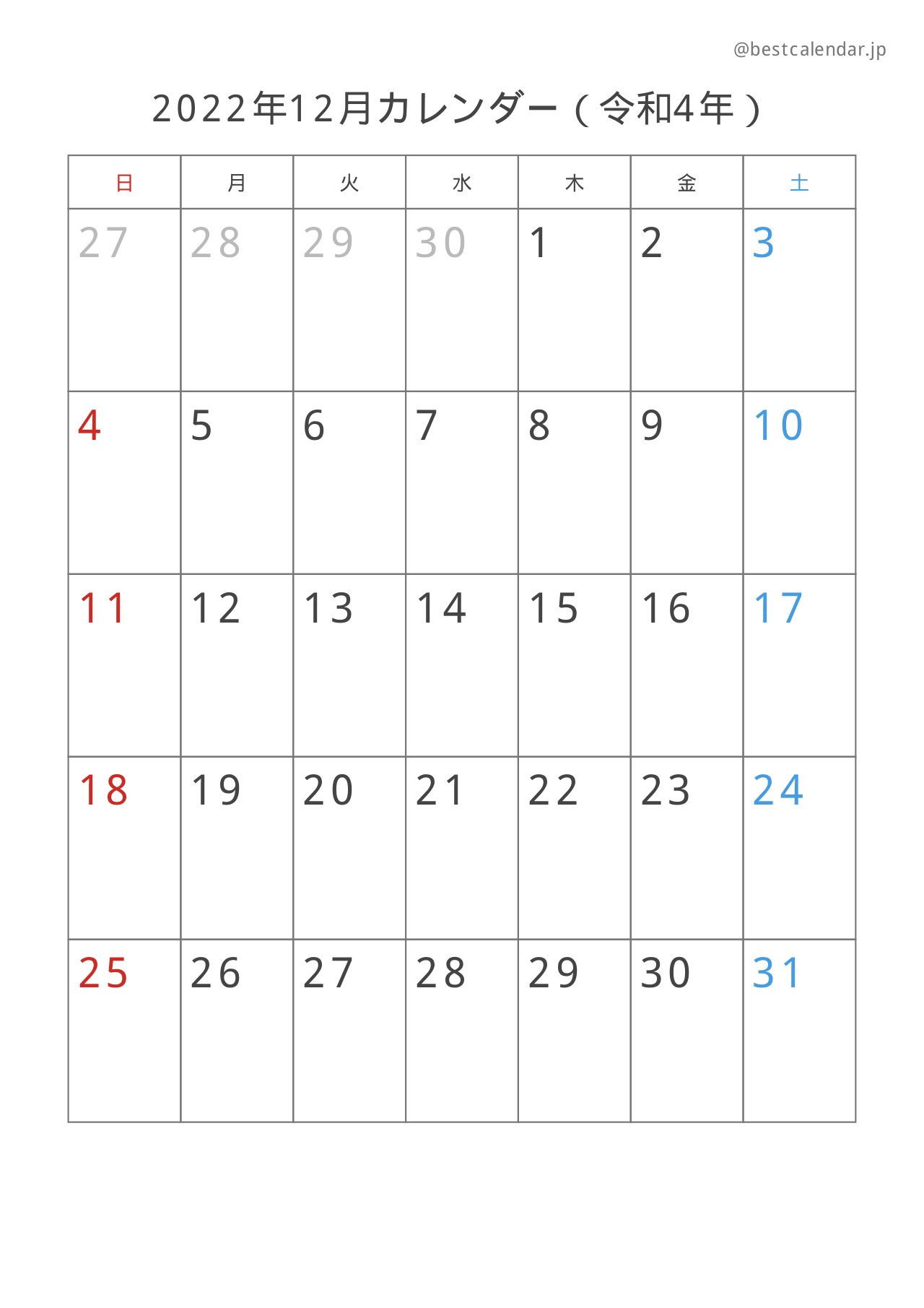 2022年12月のカレンダー(A4縦向き)です。記入重視のレイアウトで設計されています。