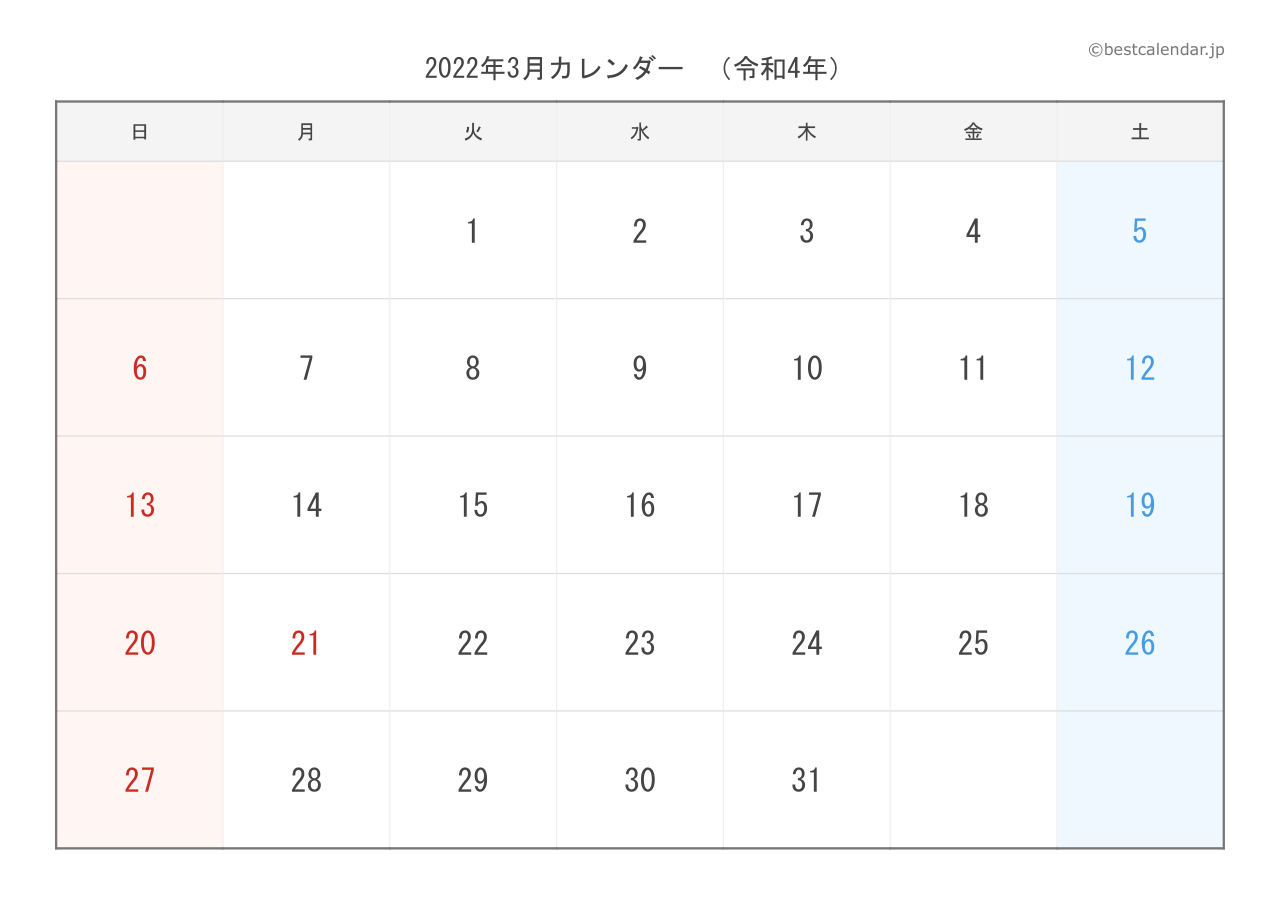 2022年3月のカレンダーです。A4サイズ横向きで印刷に最適化されています。