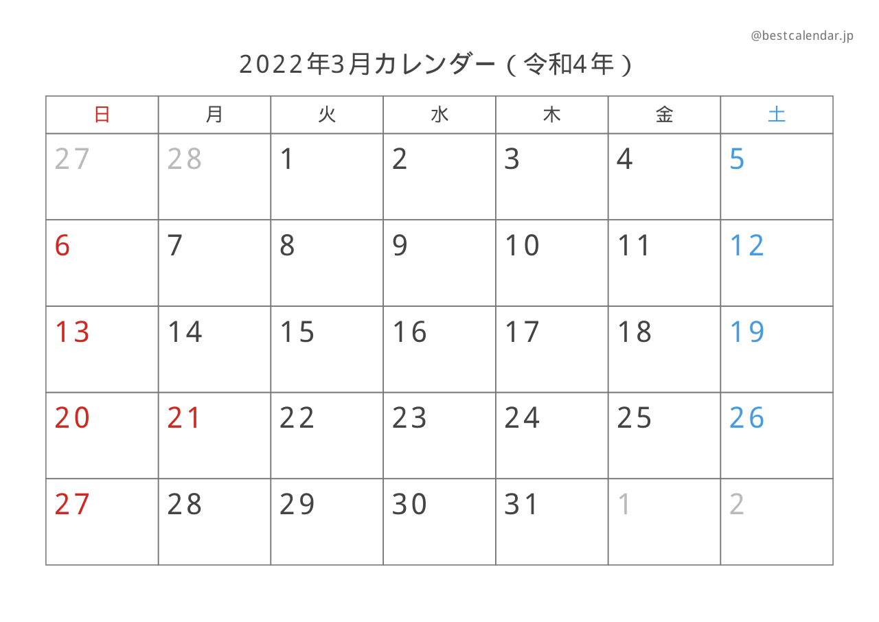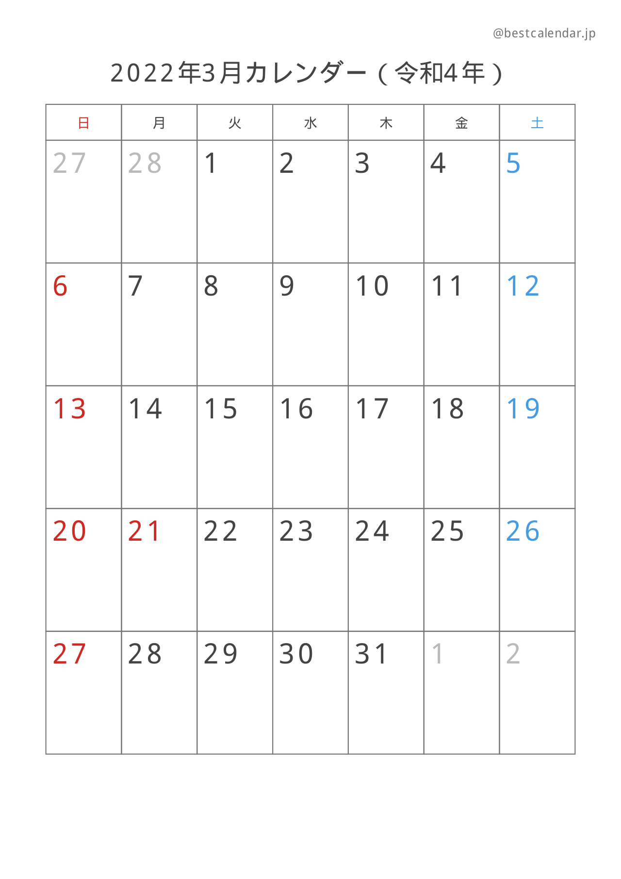 2022年3月のカレンダー(A4縦向き)です。記入重視のレイアウトで設計されています。