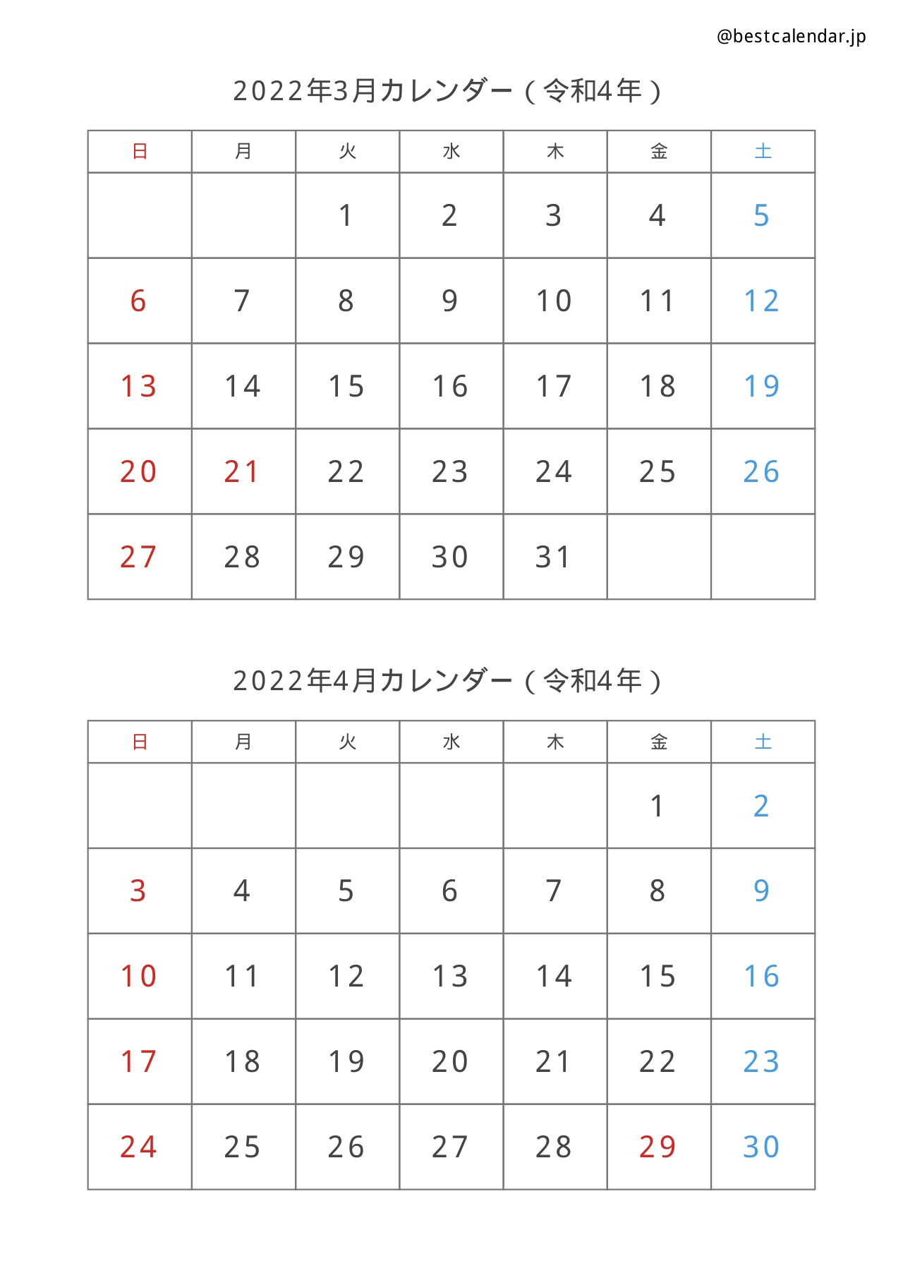2022年3-4月の2ヶ月分を1枚にまとめたA4縦向きカレンダーです。