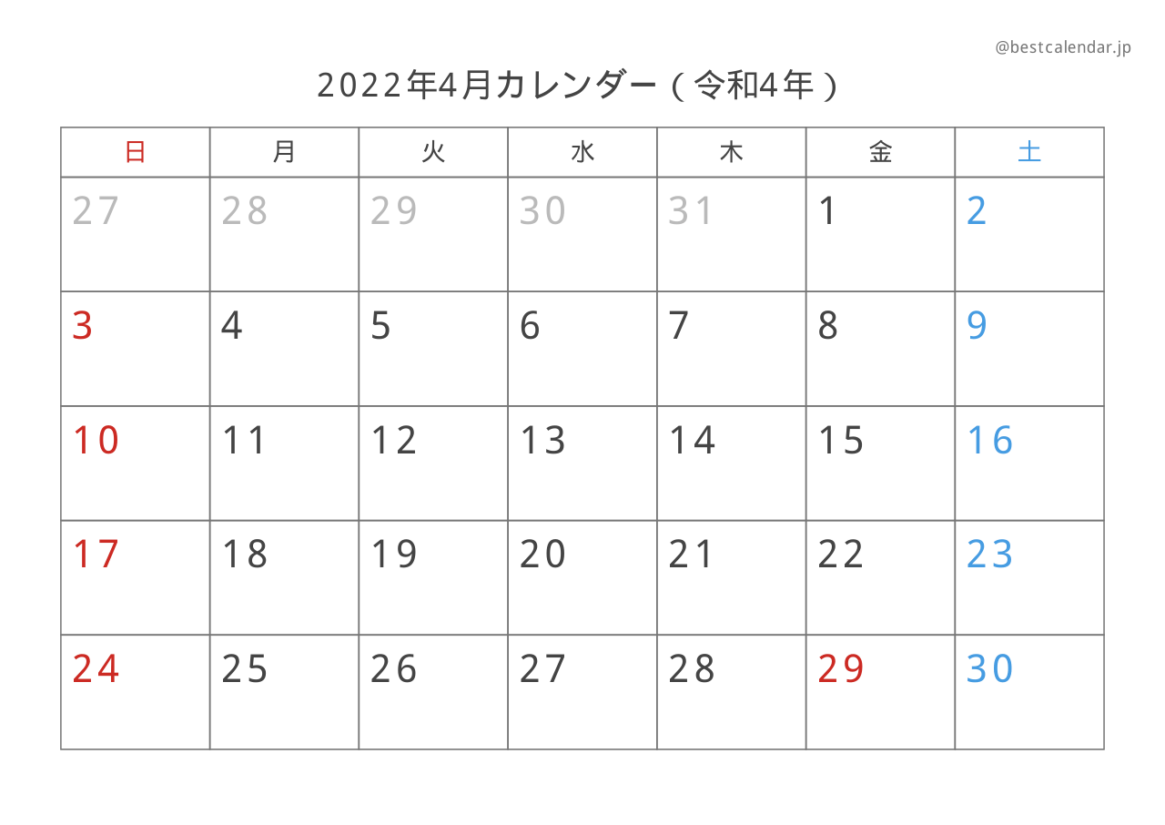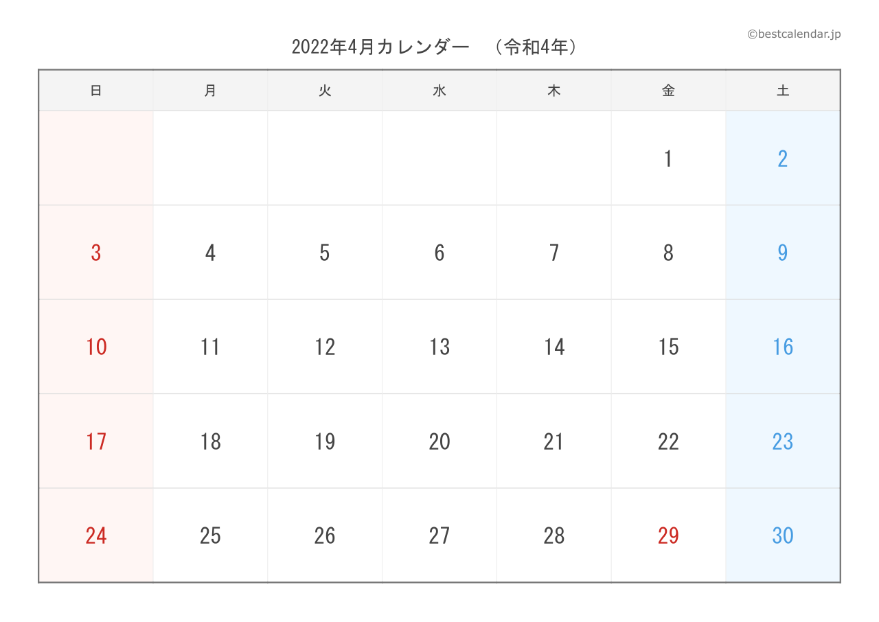 2022年4月のカレンダーです。A4サイズ横向きで印刷に最適化されています。