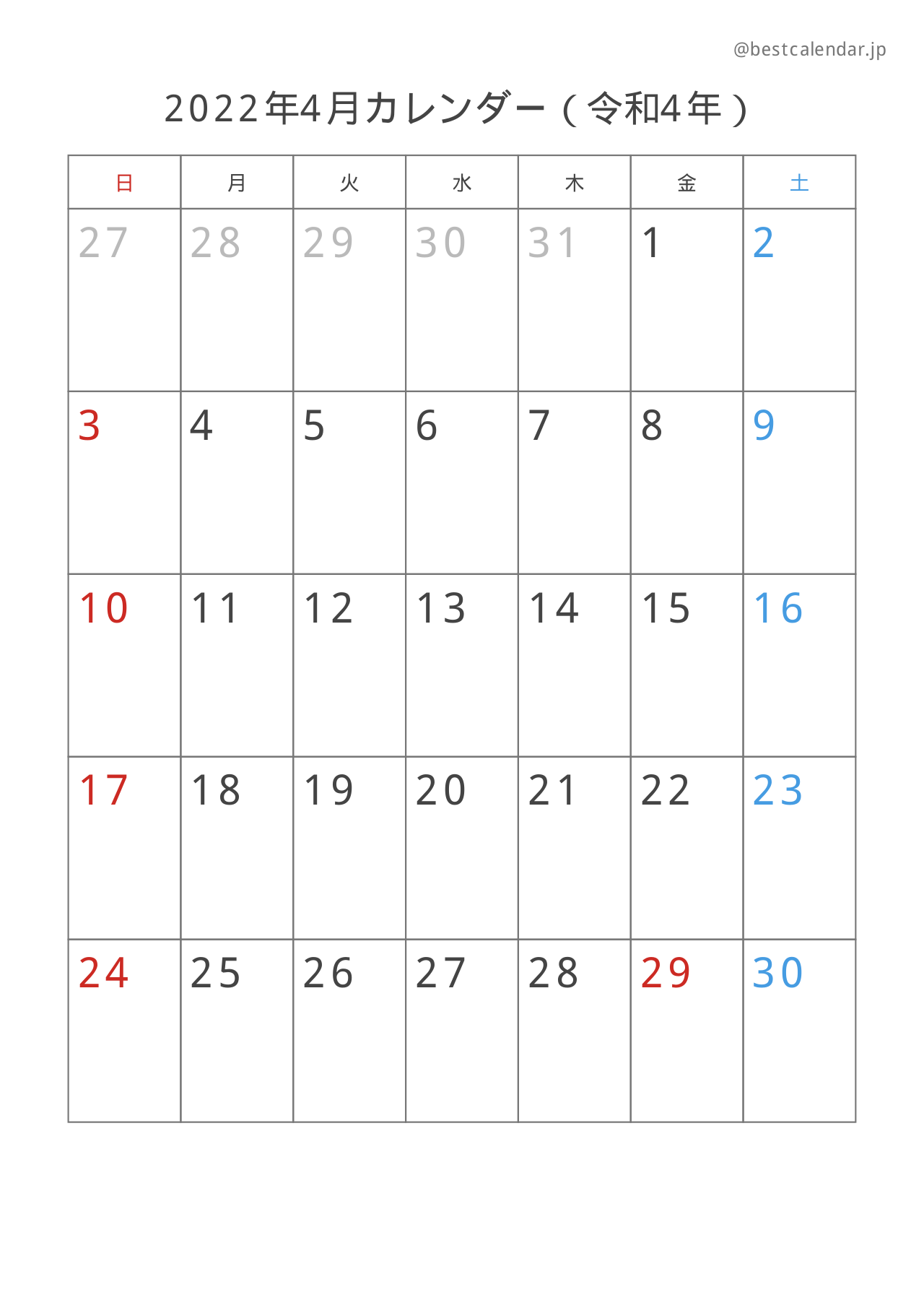 2022年4月のカレンダー(A4縦向き)です。記入重視のレイアウトで設計されています。