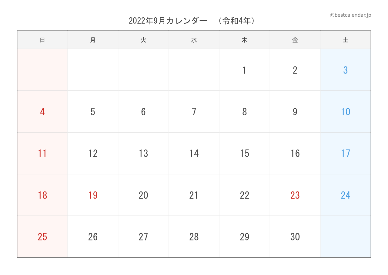 2022年9月のカレンダーです。A4サイズ横向きで印刷に最適化されています。