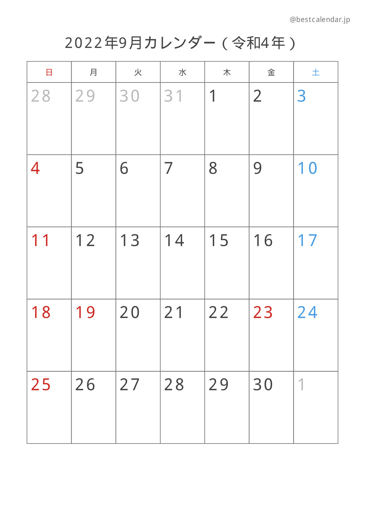 2022年9月のカレンダー(A4縦向き)です。記入重視のレイアウトで設計されています。