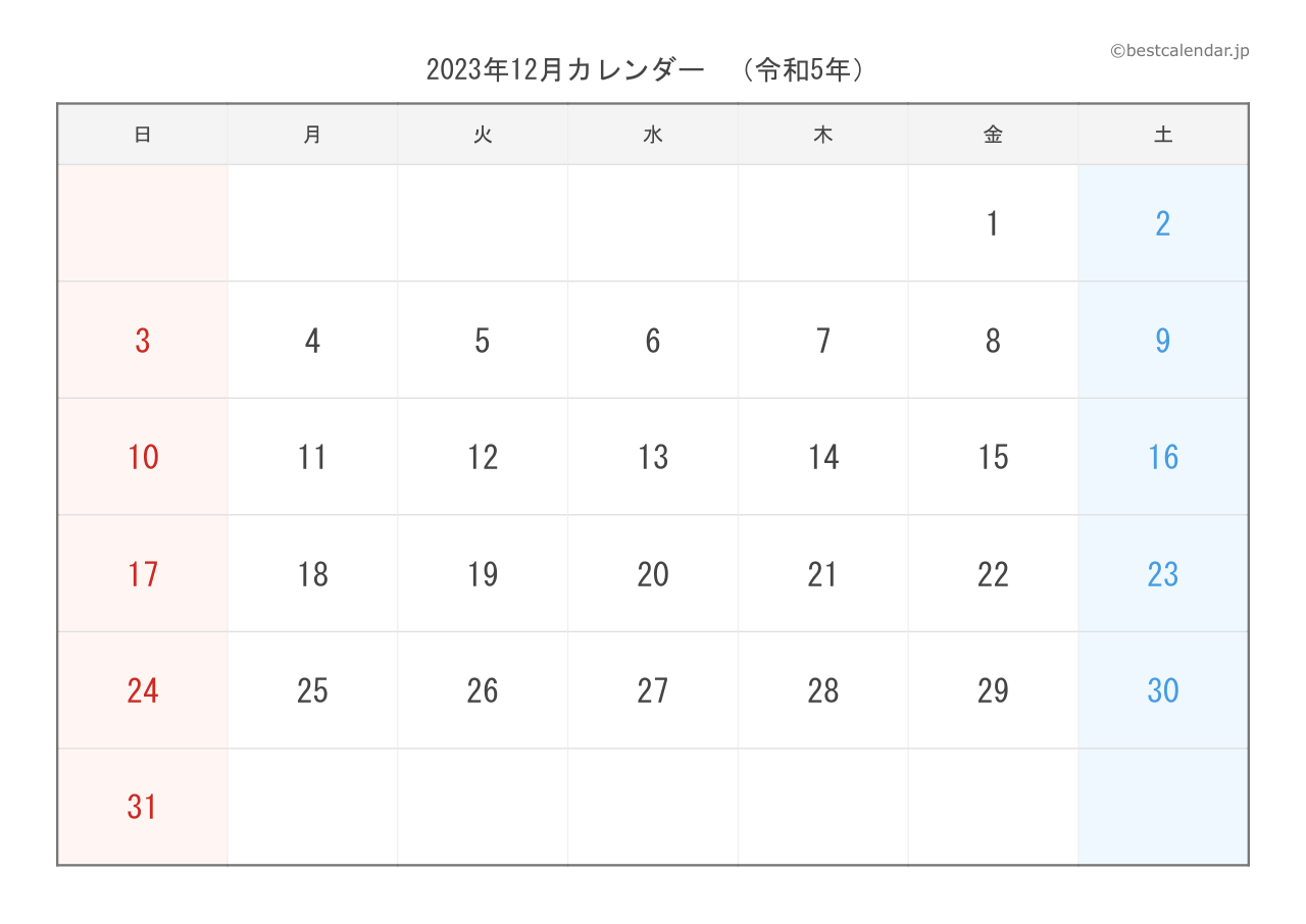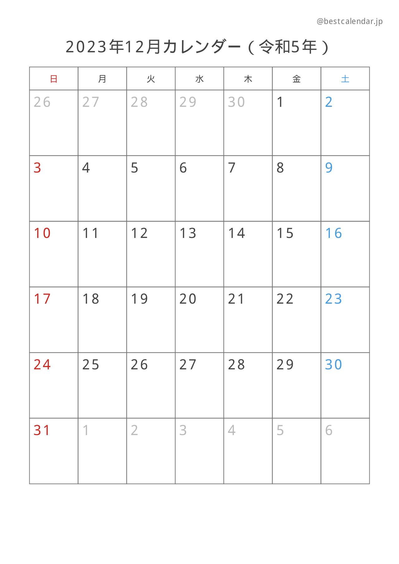 2023年12月のカレンダー(A4縦向き)です。記入重視のレイアウトで設計されています。