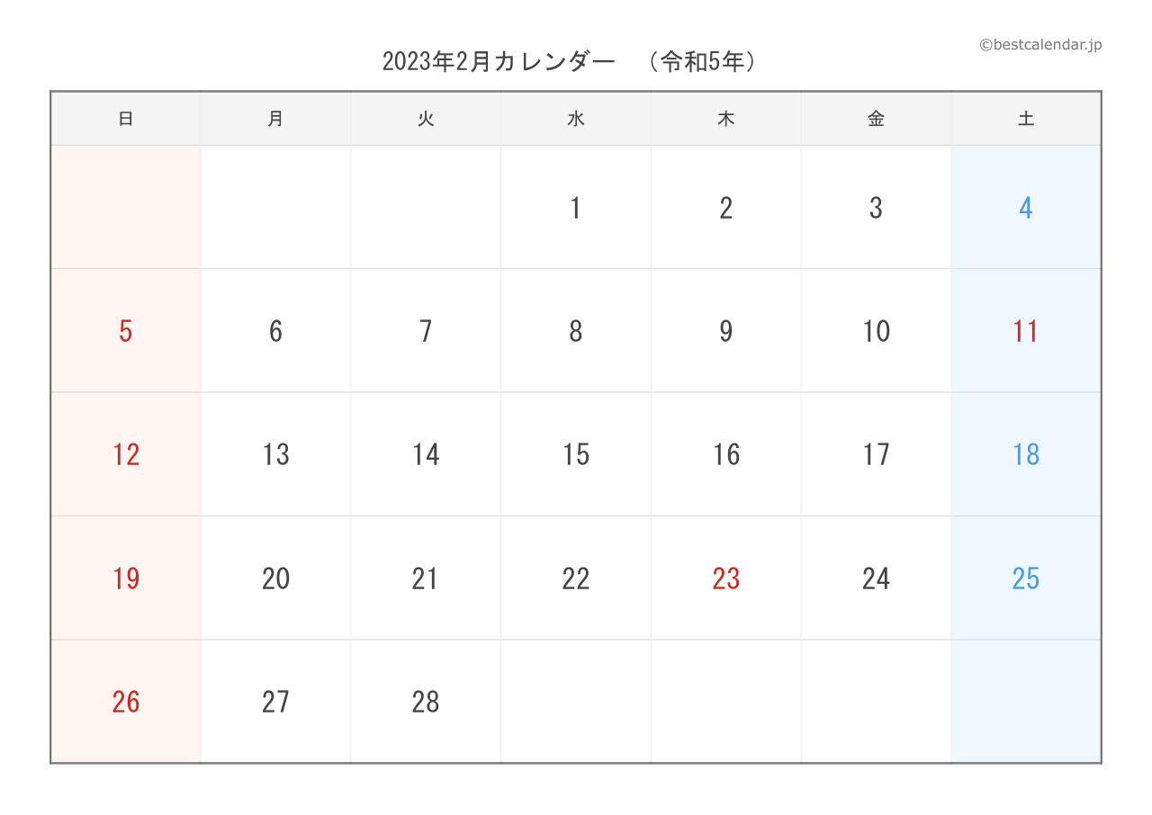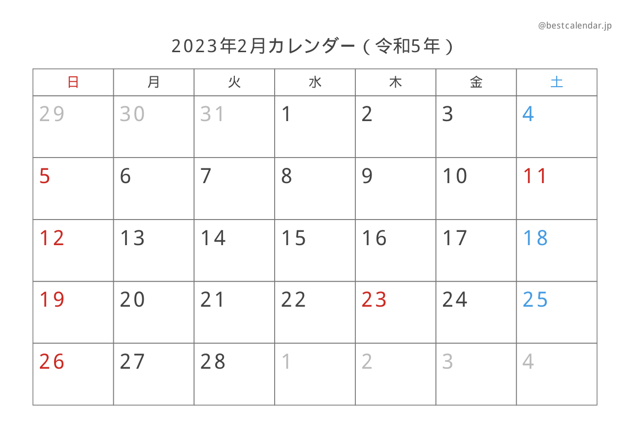 2023年2月のカレンダーです。A4サイズ横向きで印刷に最適化されています。