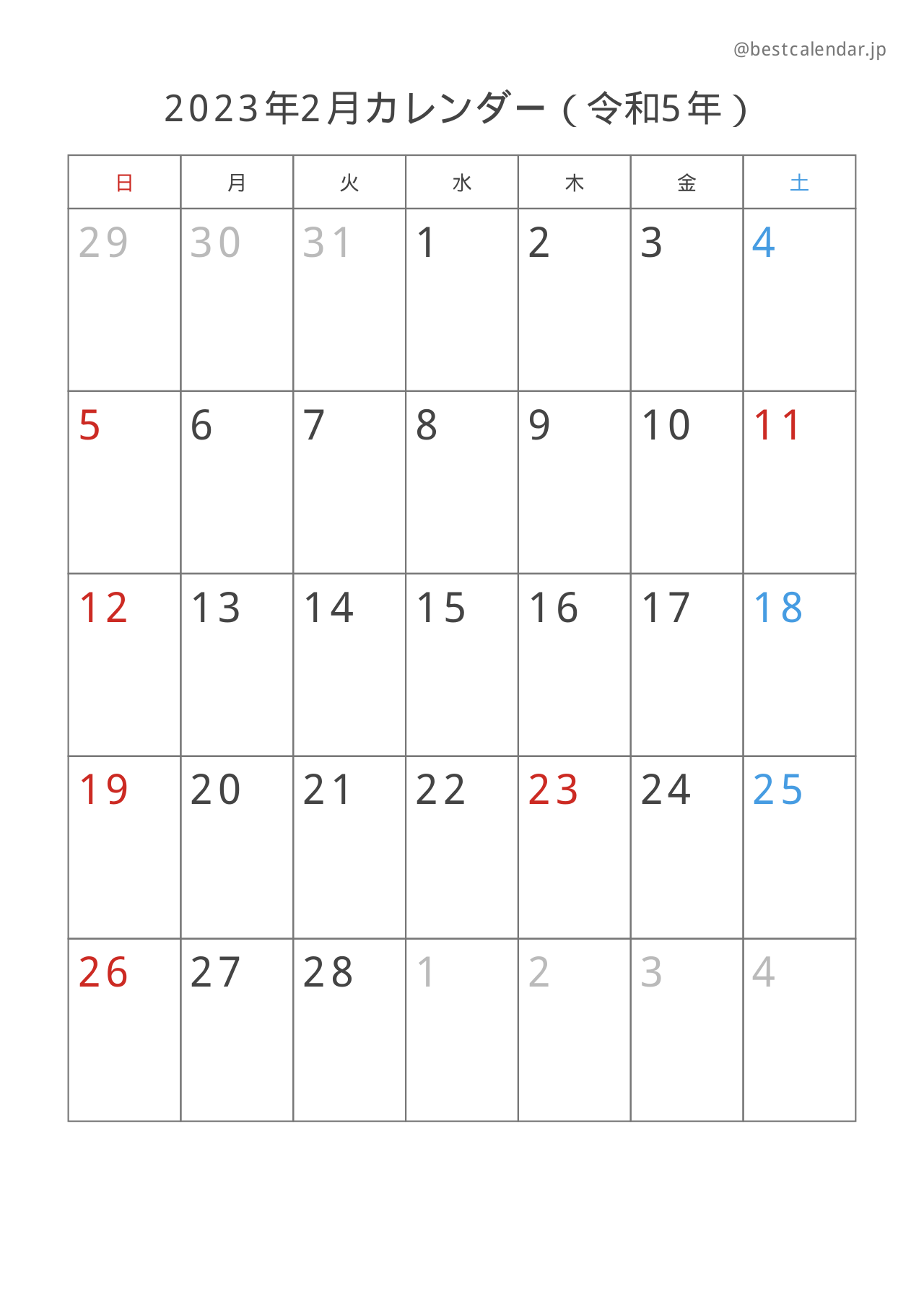 2023年2月のカレンダー(A4縦向き)です。記入重視のレイアウトで設計されています。