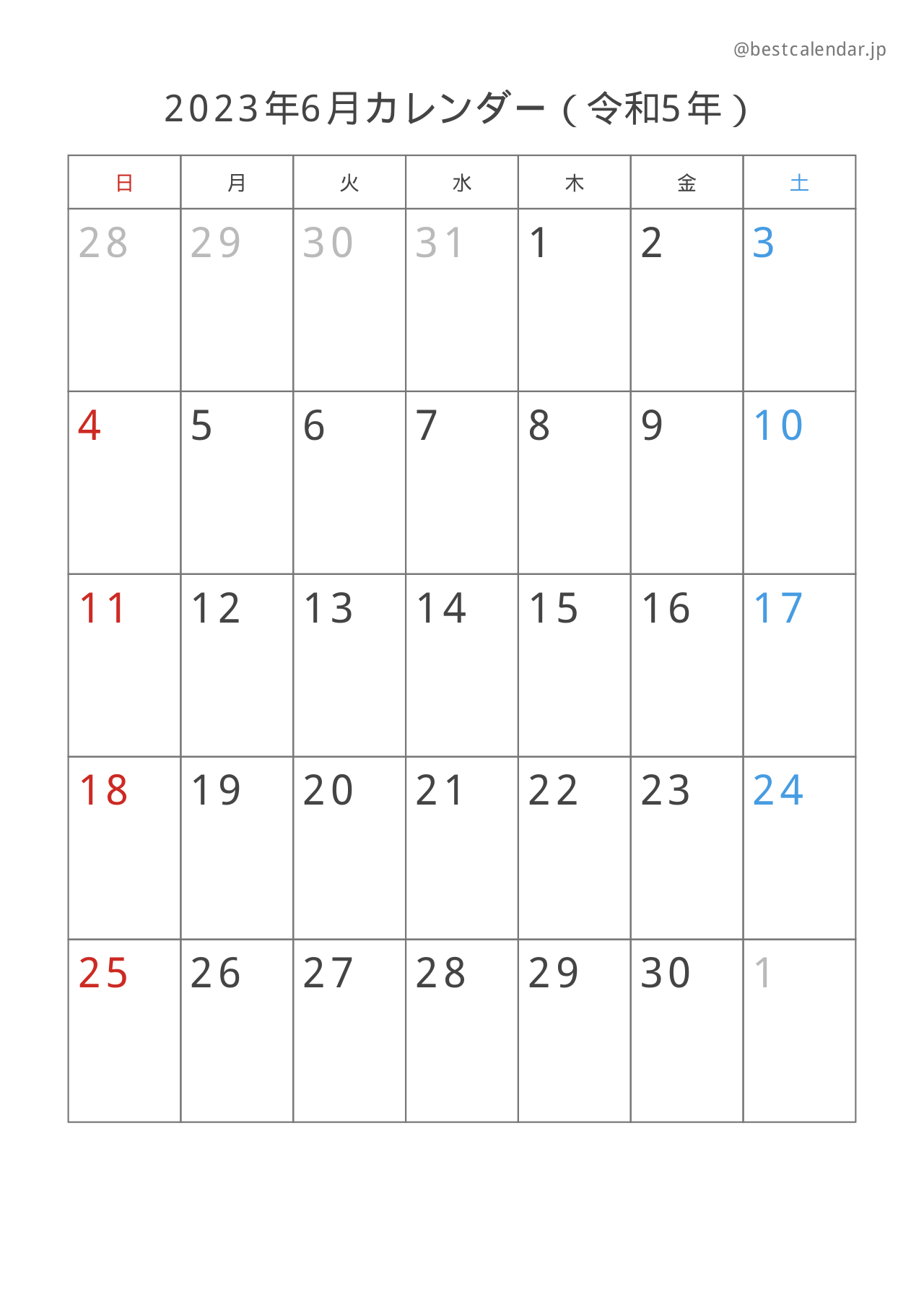 2023年6月のカレンダー(A4縦向き)です。記入重視のレイアウトで設計されています。