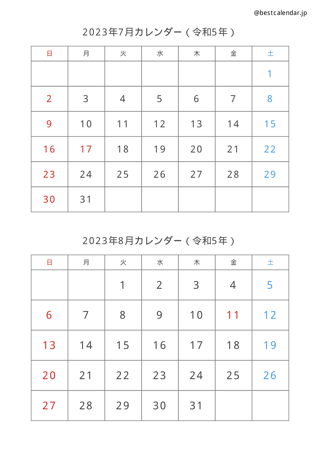 2023年7-8月の2ヶ月分を1枚にまとめたA4縦向きカレンダーです。