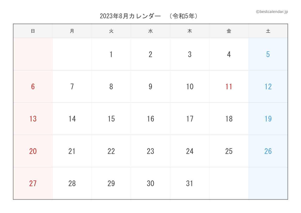 2023年8月のカレンダーです。A4サイズ横向きで印刷に最適化されています。