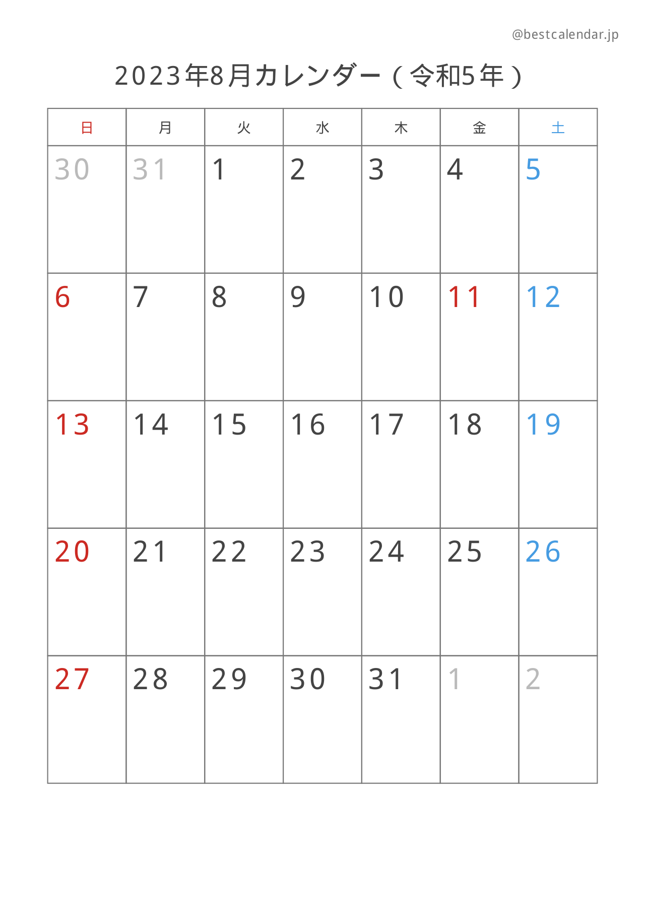 2023年8月のカレンダー(A4縦向き)です。記入重視のレイアウトで設計されています。