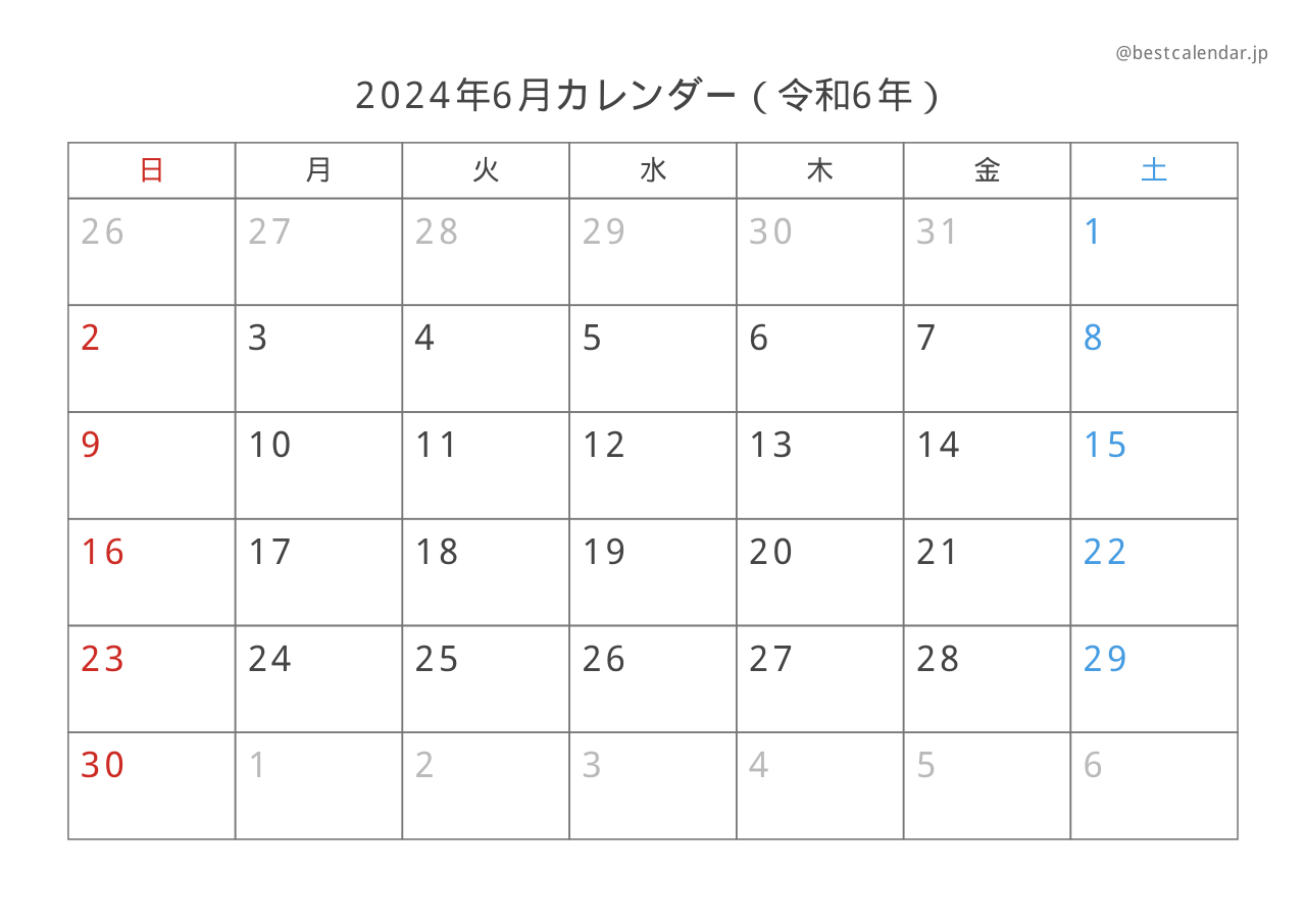 2024年6月のカレンダーです。A4サイズ横向きで印刷に最適化されています。