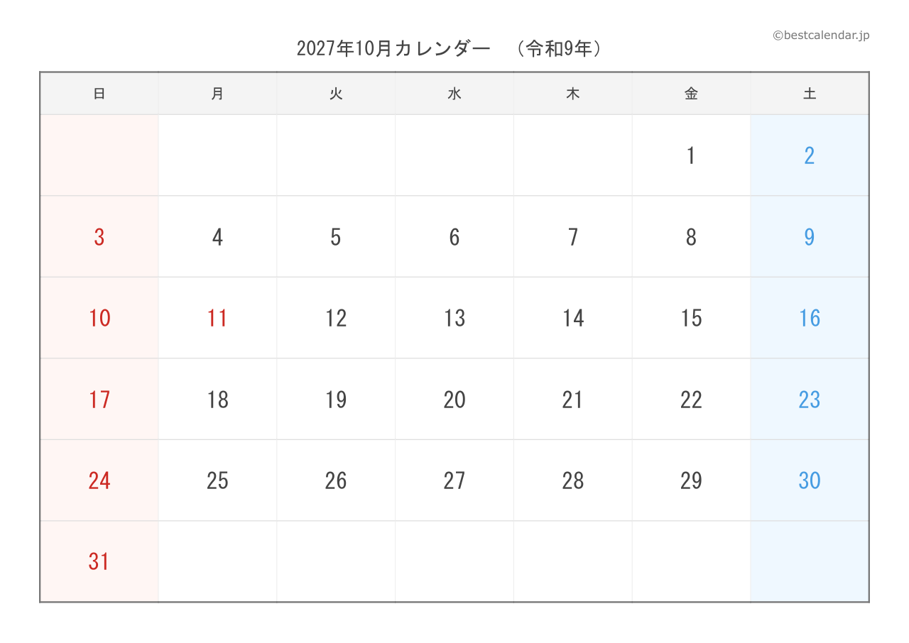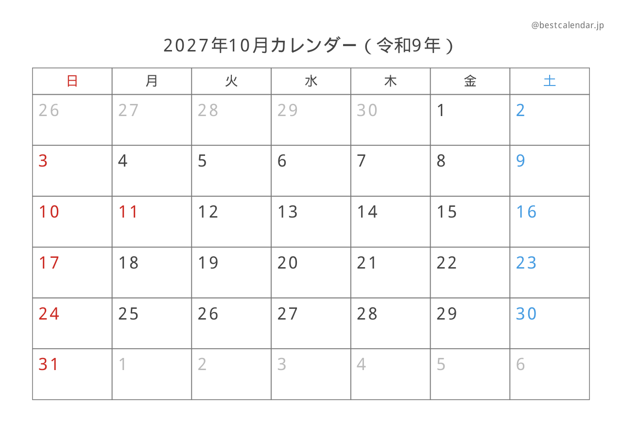 PDFファイルは高画質印刷に最適化されており、きれいに印刷できます。PNG画像形式は、スマートフォンやタブレット、パソコンでの表示に適しています。2027年10月のスケジュール管理にぜひご活用ください。