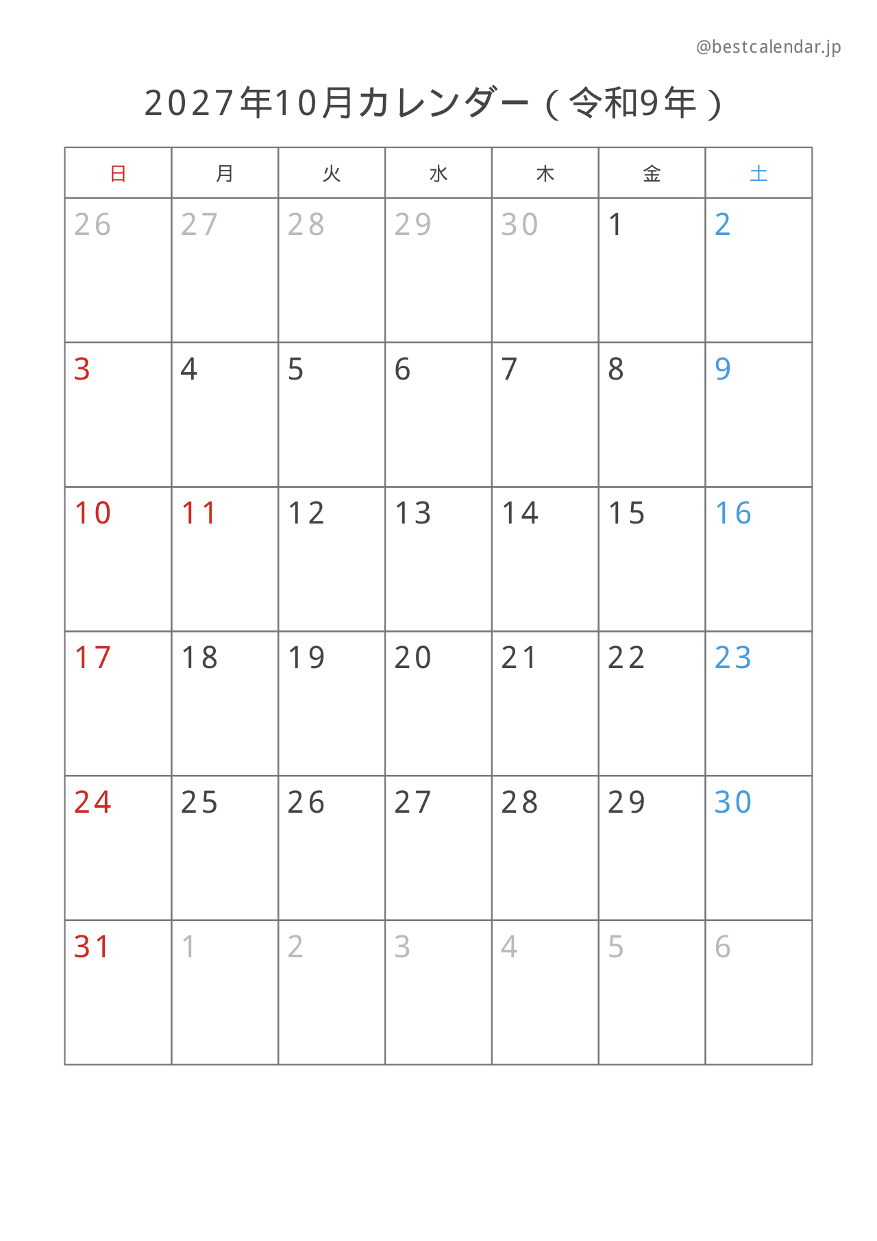 2027年10月のカレンダー(A4縦向き)です。記入重視のレイアウトで設計されています。