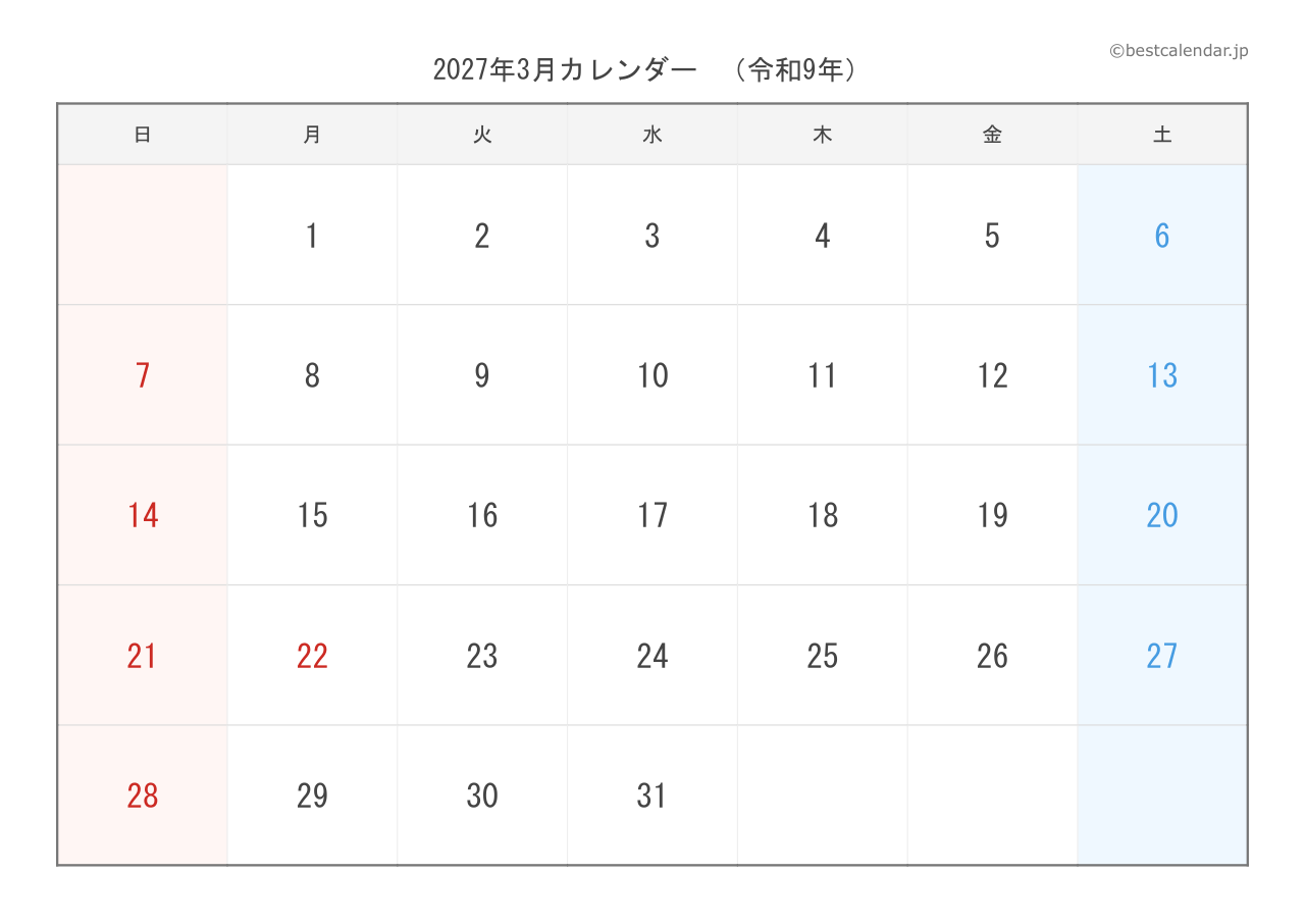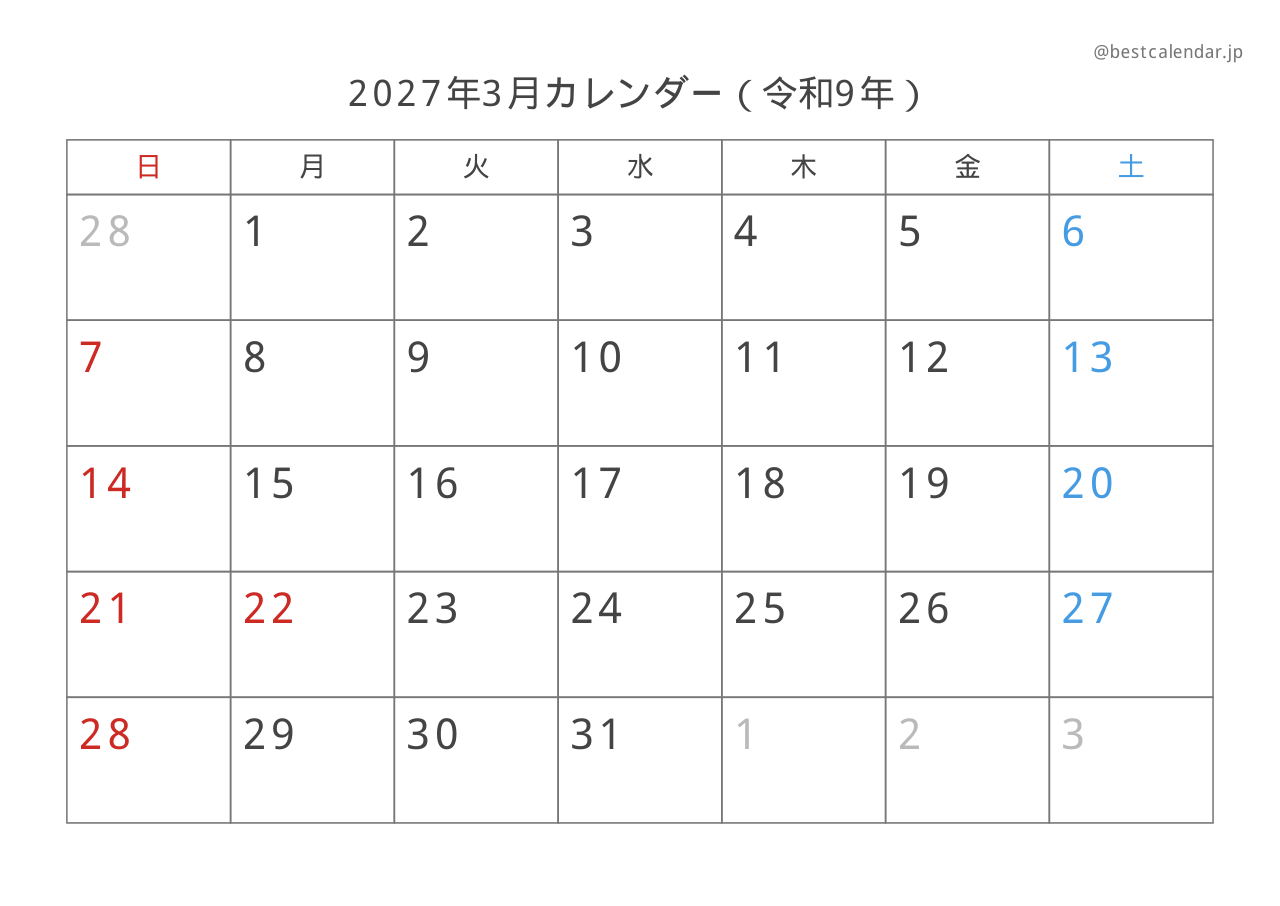 2027年3月のカレンダーです。A4サイズ横向きで印刷に最適化されています。