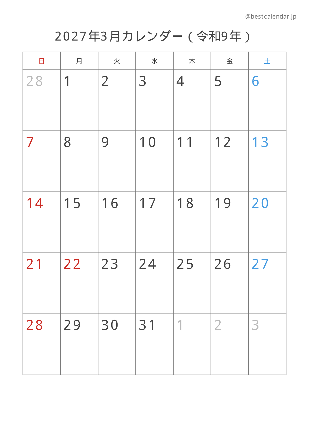 2027年3月のカレンダー(A4縦向き)です。記入重視のレイアウトで設計されています。