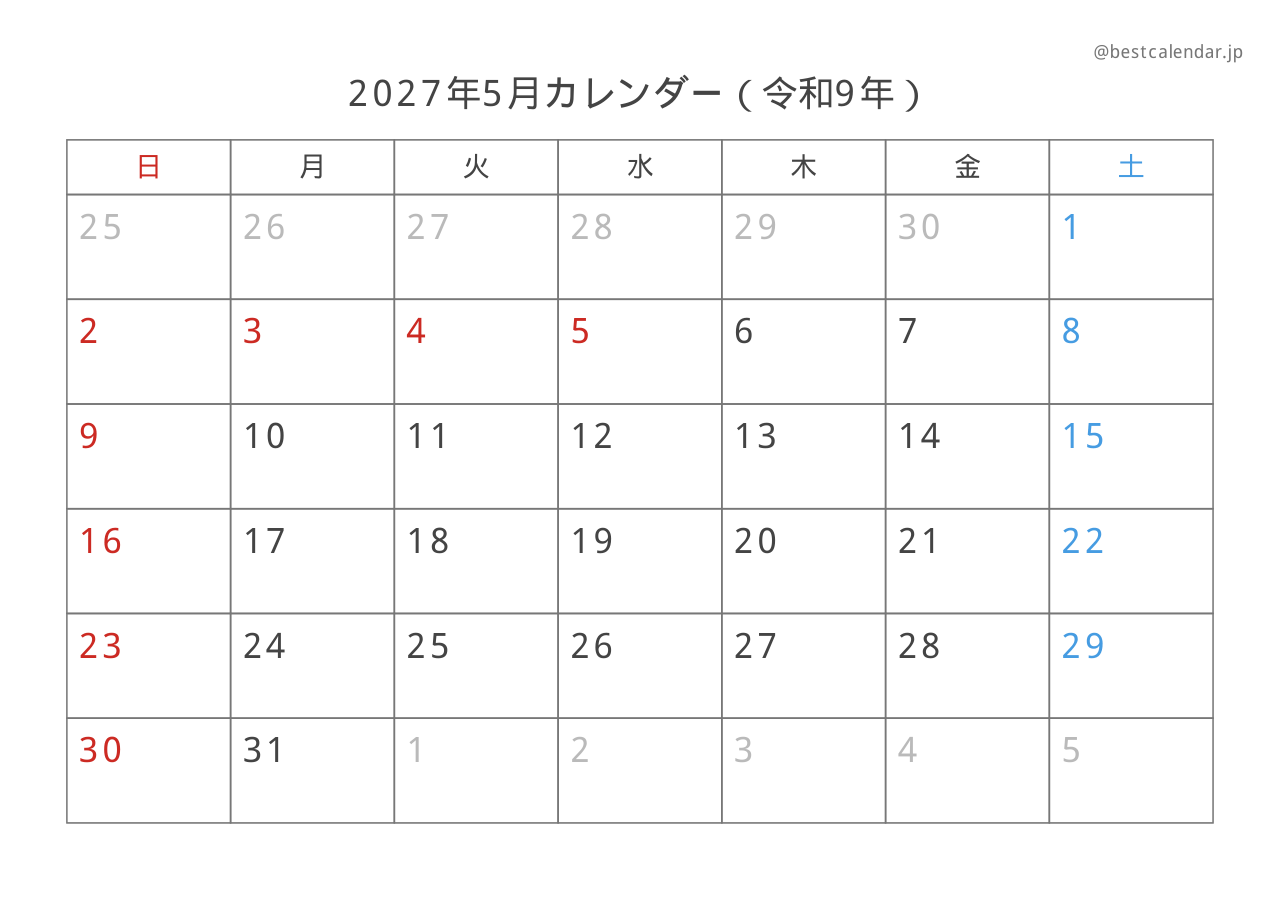PDFファイルは高画質印刷に最適化されており、きれいに印刷できます。PNG画像形式は、スマートフォンやタブレット、パソコンでの表示に適しています。2027年5月のスケジュール管理にぜひご活用ください。