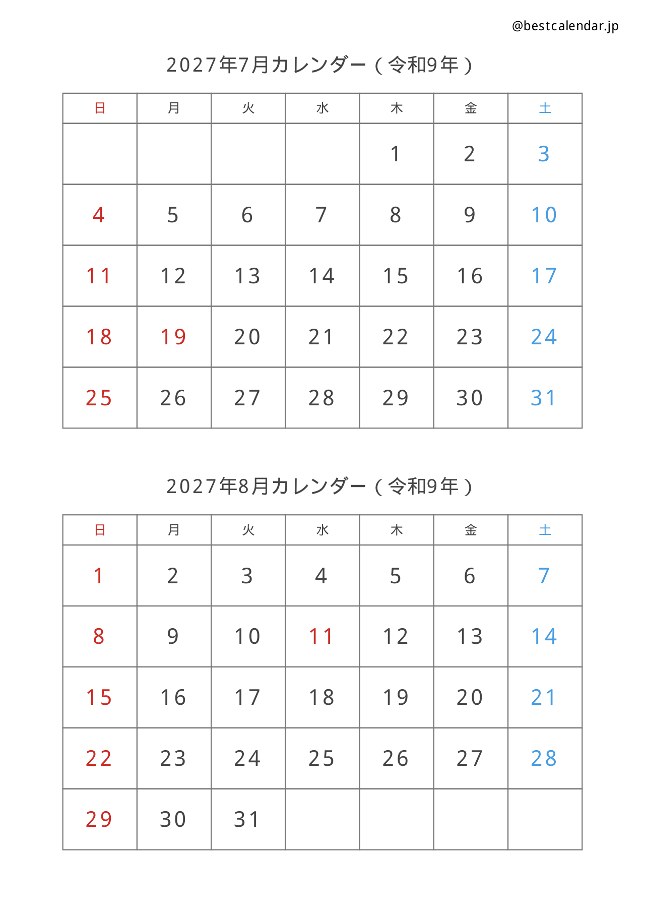 2027年7-8月の2ヶ月分を1枚にまとめたA4縦向きカレンダーです。