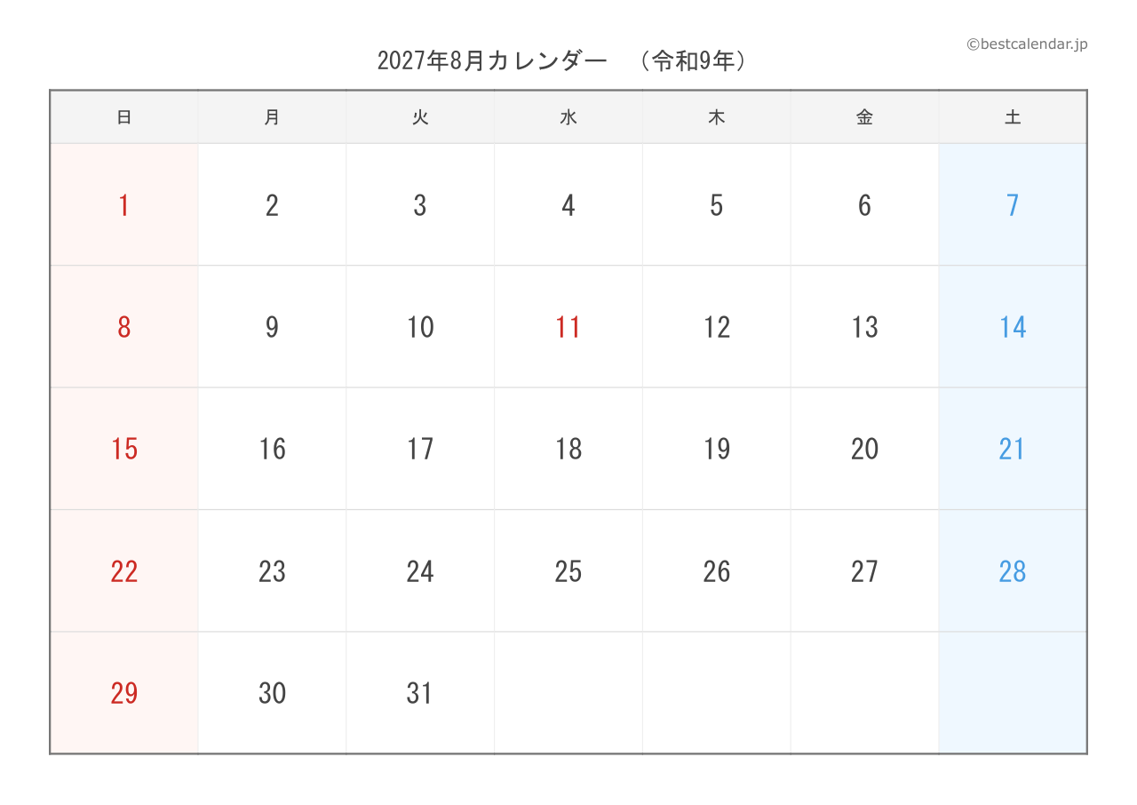2027年8月のカレンダーです。A4サイズ横向きで印刷に最適化されています。