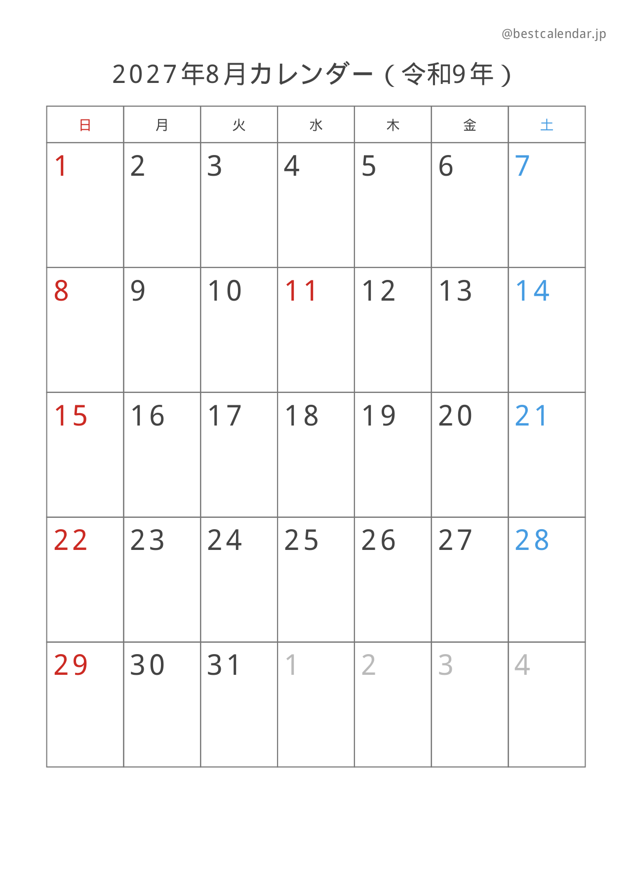 2027年8月のカレンダー(A4縦向き)です。記入重視のレイアウトで設計されています。