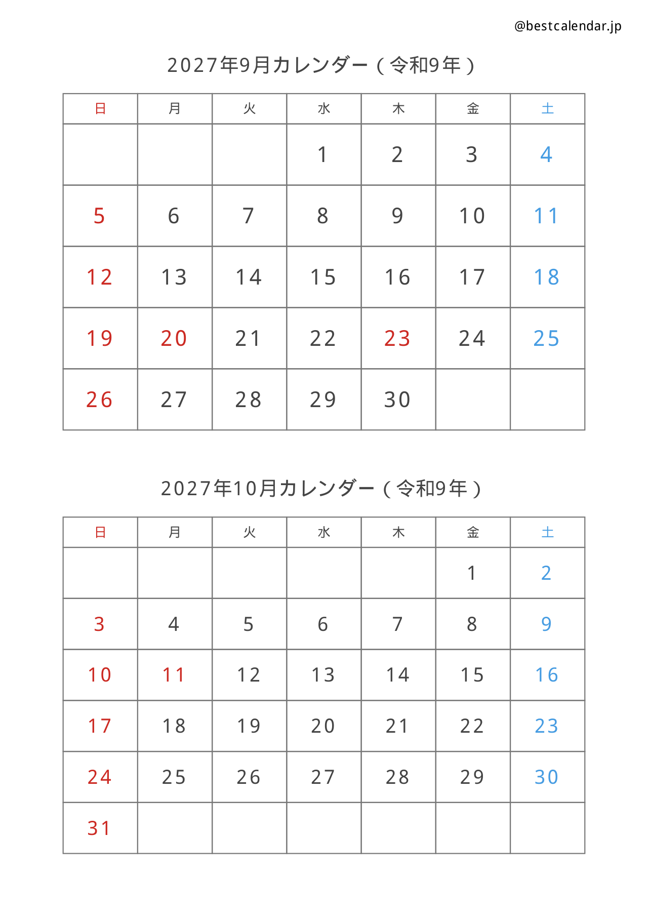 2027年9-10月の2ヶ月分を1枚にまとめたA4縦向きカレンダーです。