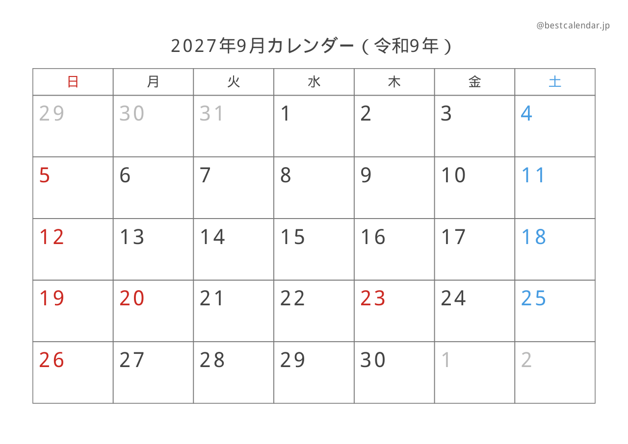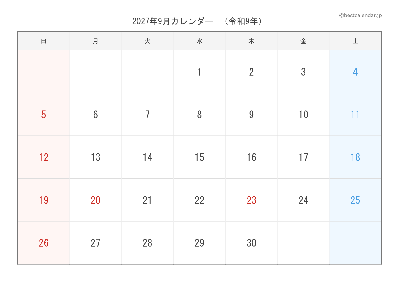 2027年9月のカレンダーです。A4サイズ横向きで印刷に最適化されています。
