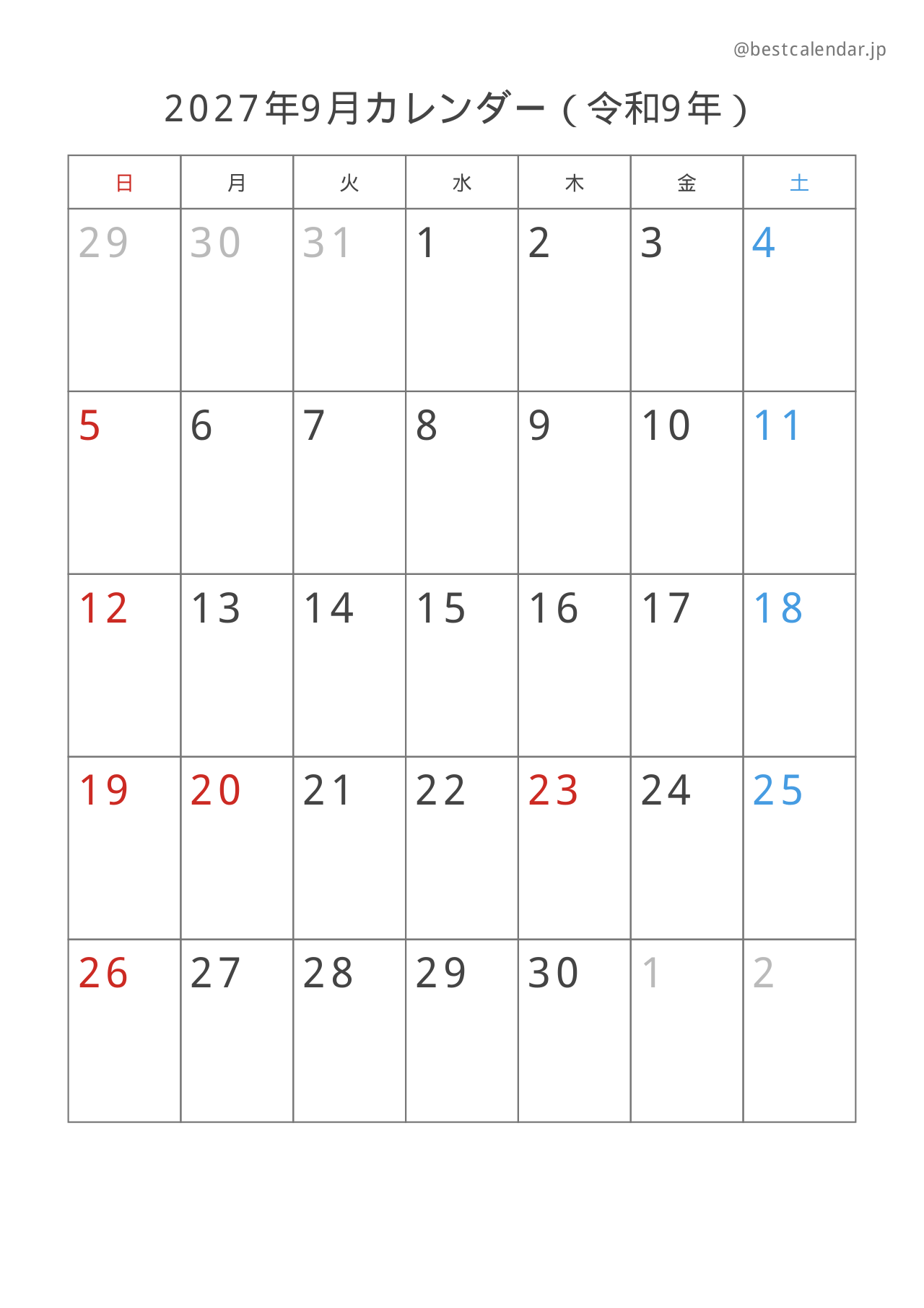 2027年9月のカレンダー(A4縦向き)です。記入重視のレイアウトで設計されています。