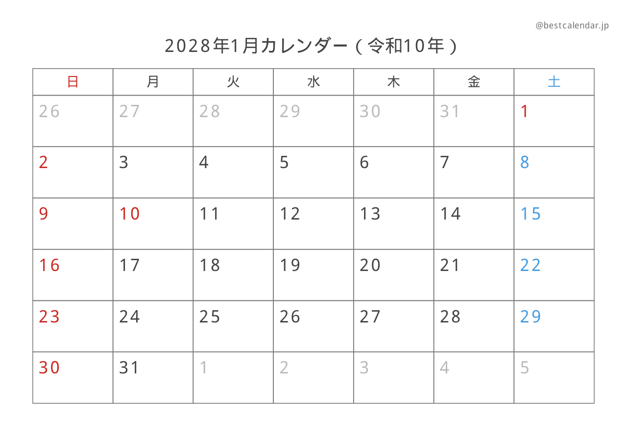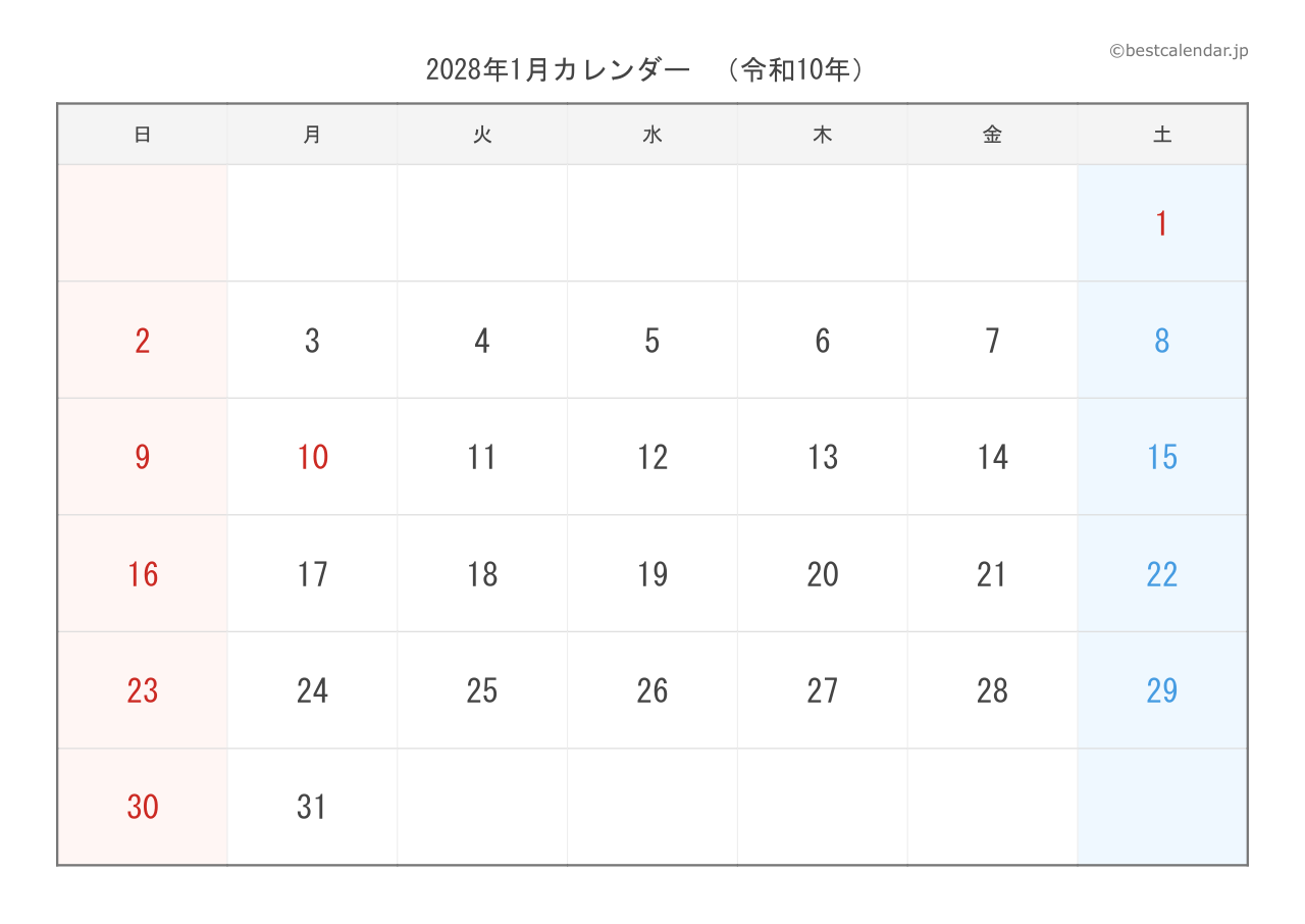 PDFファイルは高画質印刷に最適化されており、きれいに印刷できます。PNG画像形式は、スマートフォンやタブレット、パソコンでの表示に適しています。2028年1月のスケジュール管理にぜひご活用ください。