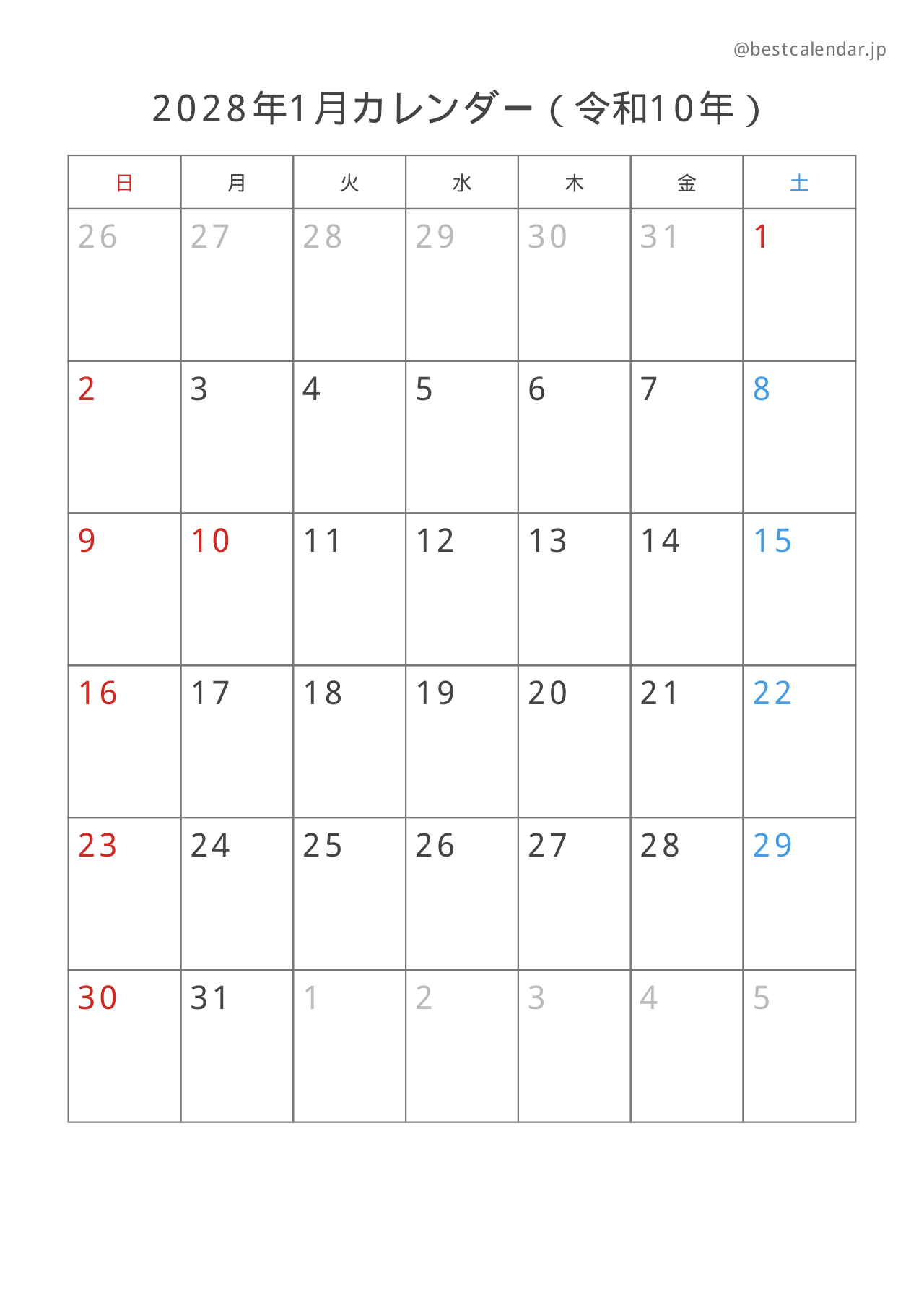 2028年1月のカレンダー(A4縦向き)です。記入重視のレイアウトで設計されています。