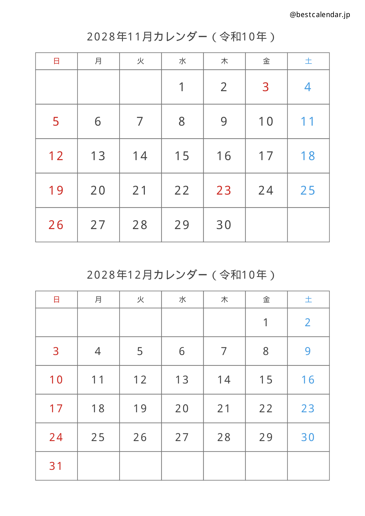 2028年11-12月の2ヶ月分を1枚にまとめたA4縦向きカレンダーです。