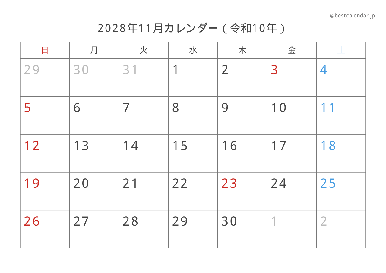 2028年11月のカレンダーです。A4サイズ横向きで印刷に最適化されています。