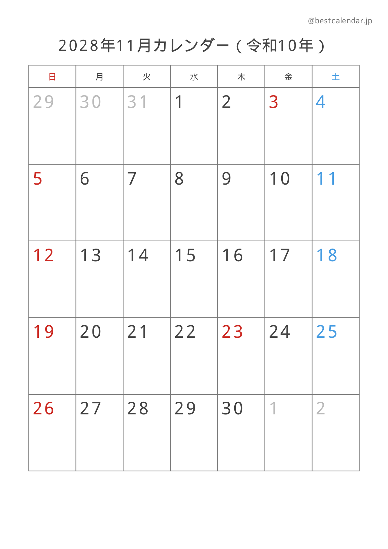2028年11月のカレンダー(A4縦向き)です。記入重視のレイアウトで設計されています。
