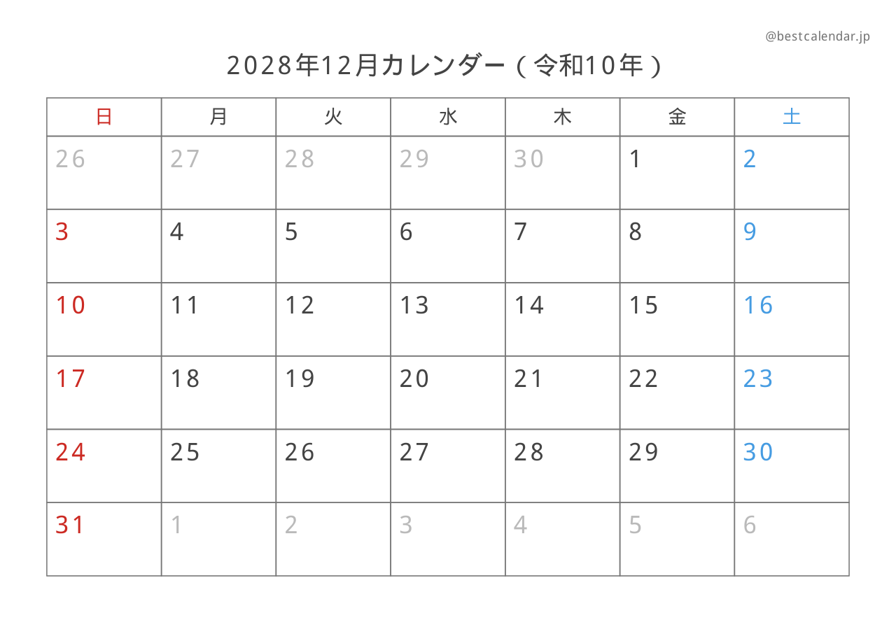 2028年12月のカレンダーです。A4サイズ横向きで印刷に最適化されています。