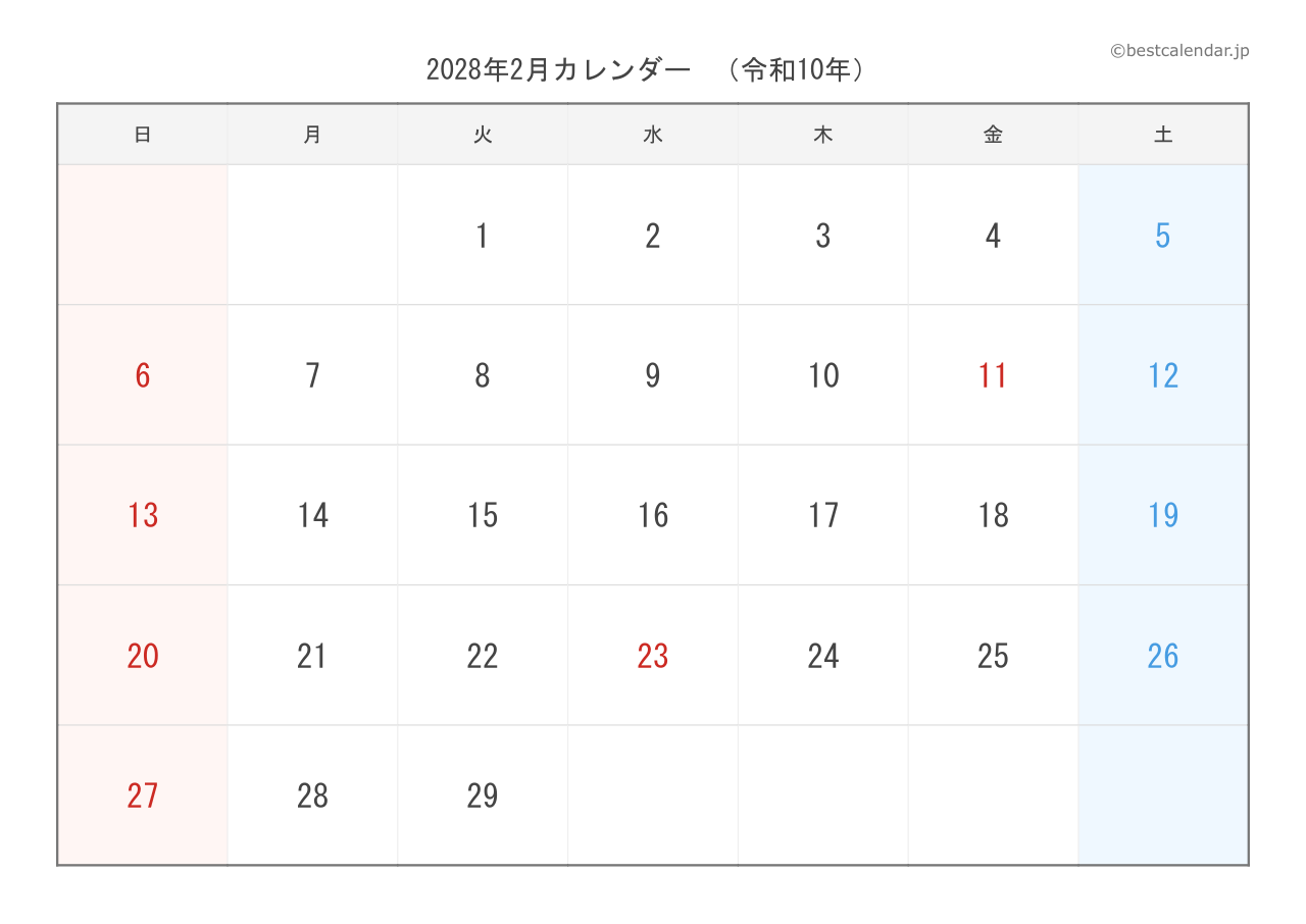 PDFファイルは高画質印刷に最適化されており、きれいに印刷できます。PNG画像形式は、スマートフォンやタブレット、パソコンでの表示に適しています。2028年2月のスケジュール管理にぜひご活用ください。