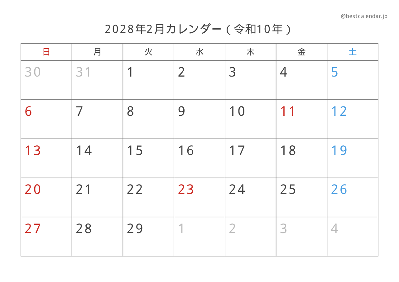 2028年2月のカレンダーです。A4サイズ横向きで印刷に最適化されています。