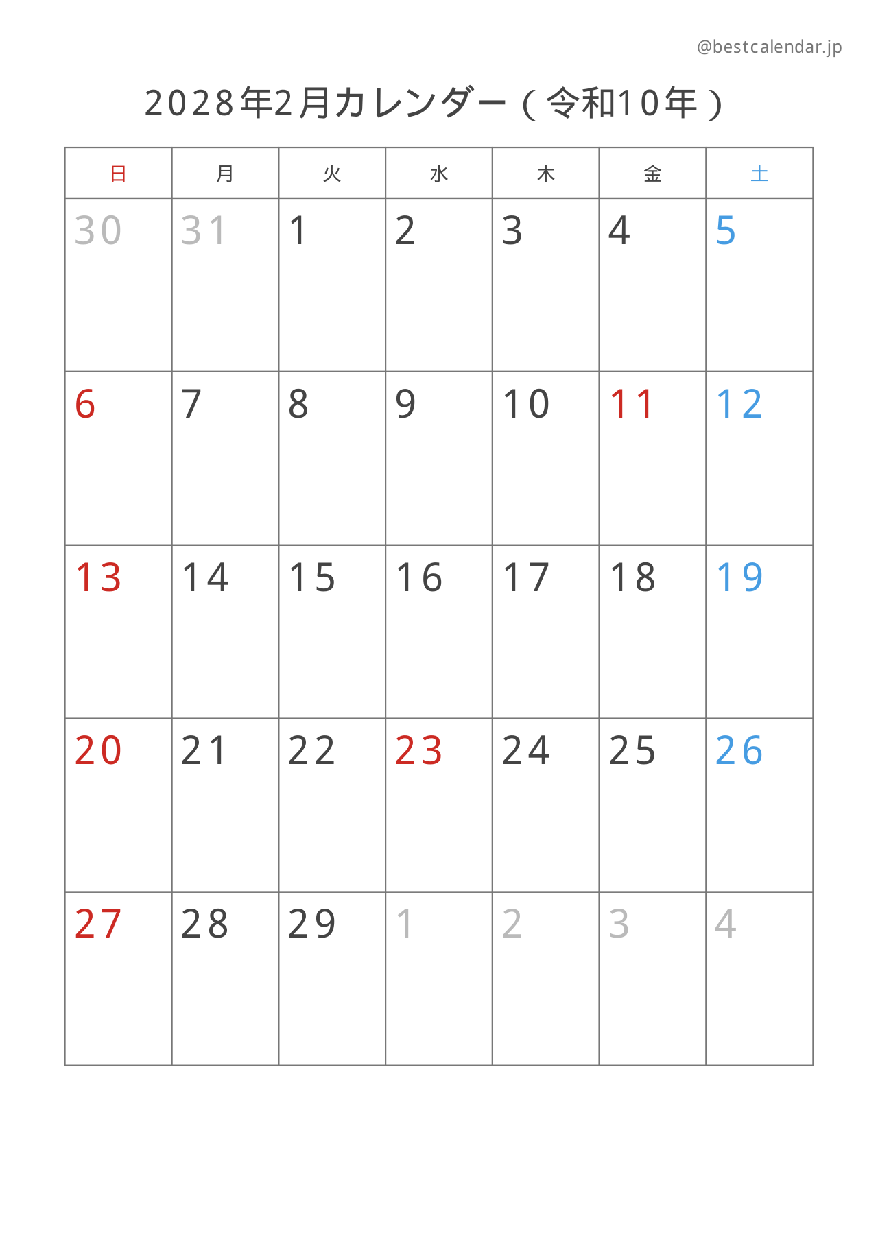 2028年2月のカレンダー(A4縦向き)です。記入重視のレイアウトで設計されています。