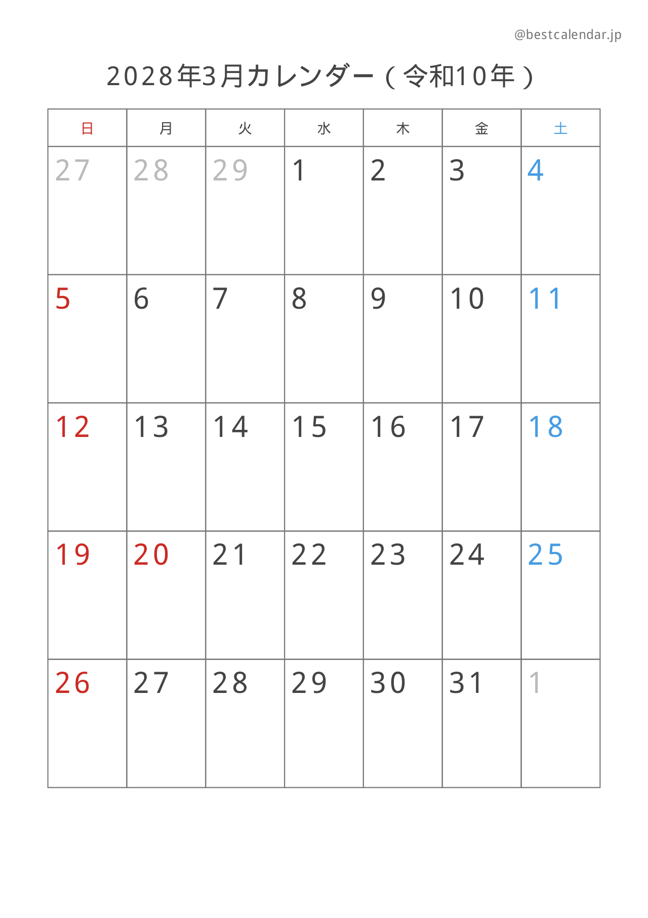 2028年3月のカレンダー(A4縦向き)です。記入重視のレイアウトで設計されています。