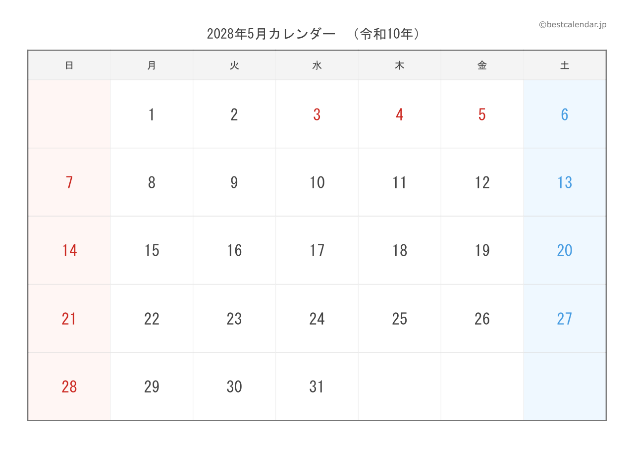 PDFファイルは高画質印刷に最適化されており、きれいに印刷できます。PNG画像形式は、スマートフォンやタブレット、パソコンでの表示に適しています。2028年5月のスケジュール管理にぜひご活用ください。