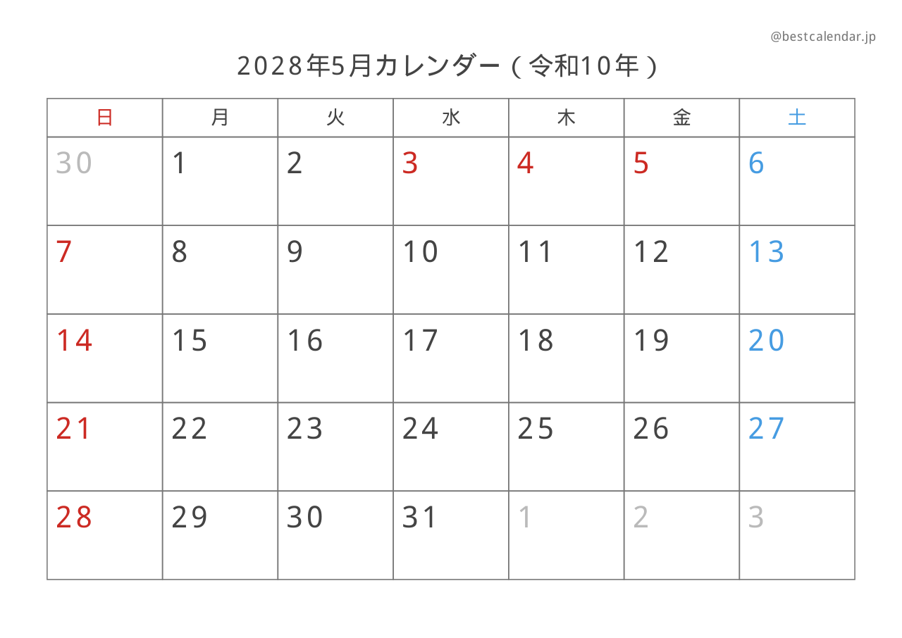 2028年5月のカレンダーです。A4サイズ横向きで印刷に最適化されています。