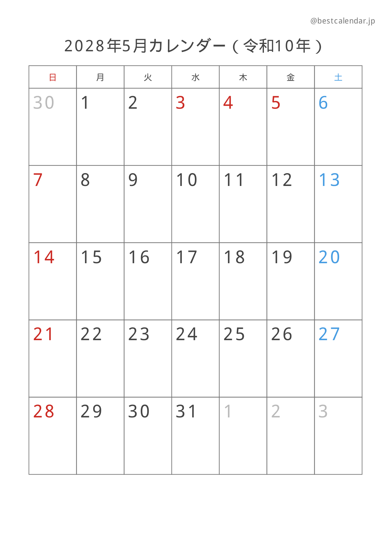 2028年5月のカレンダー(A4縦向き)です。記入重視のレイアウトで設計されています。