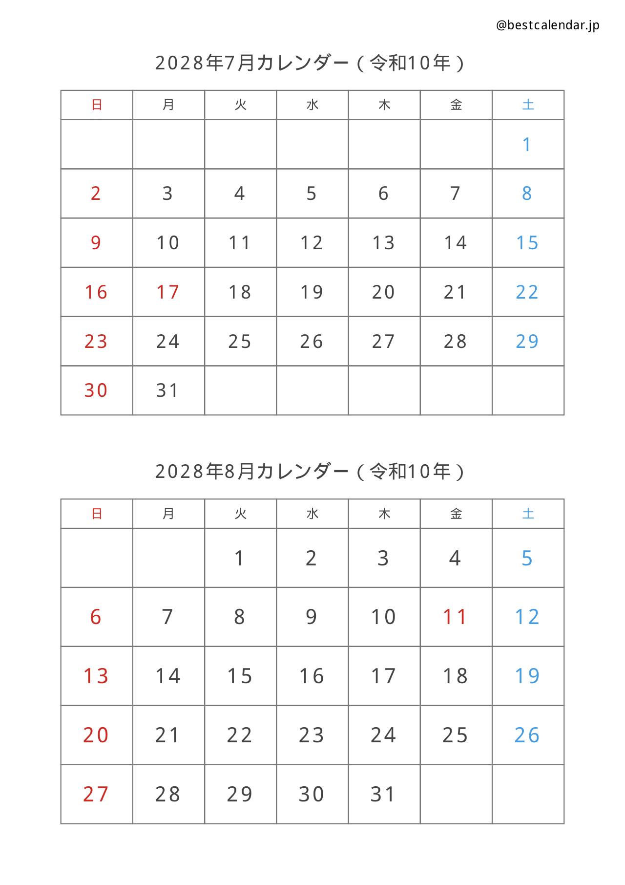 2028年7-8月の2ヶ月分を1枚にまとめたA4縦向きカレンダーです。