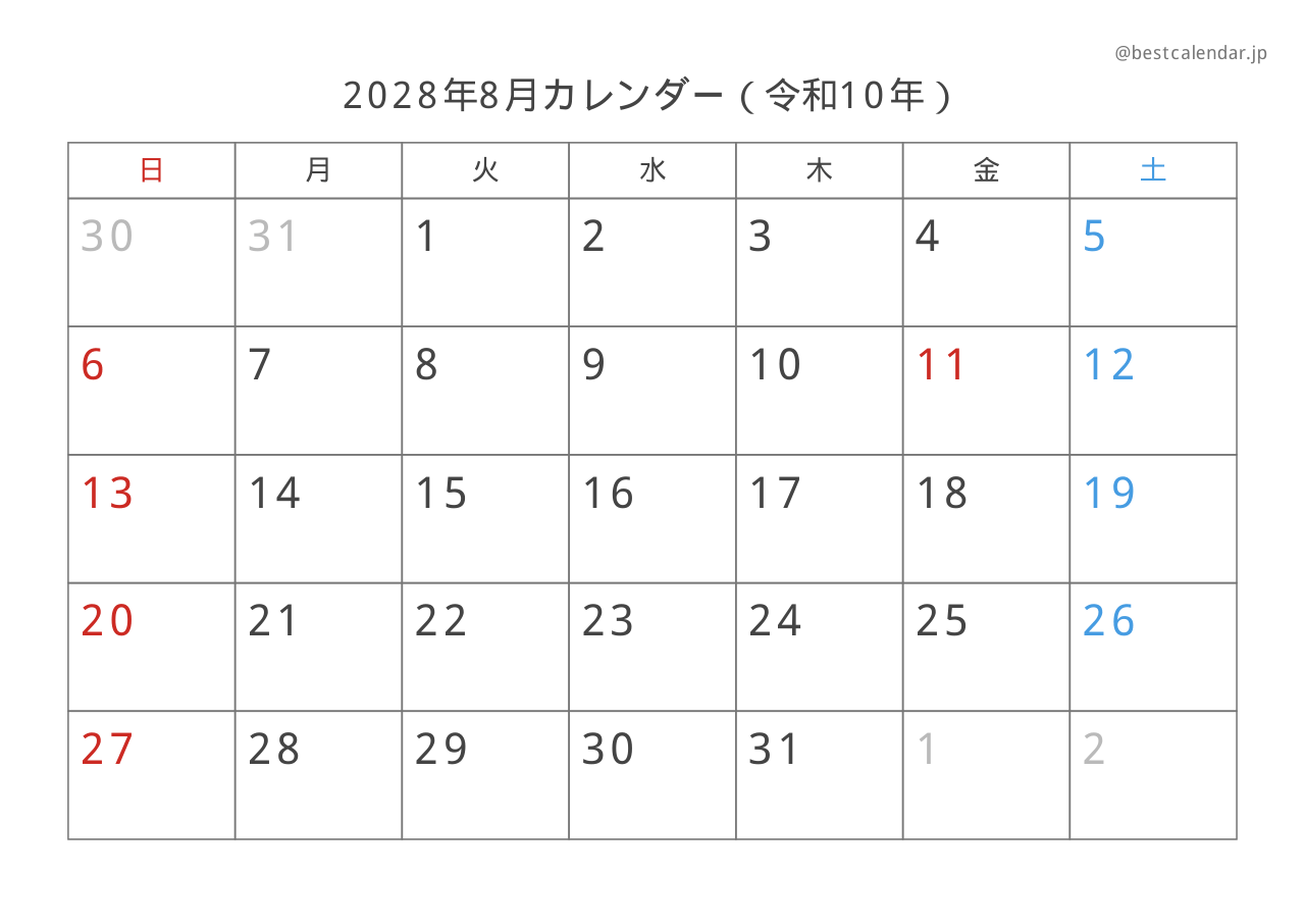 2028年8月のカレンダーです。A4サイズ横向きで印刷に最適化されています。